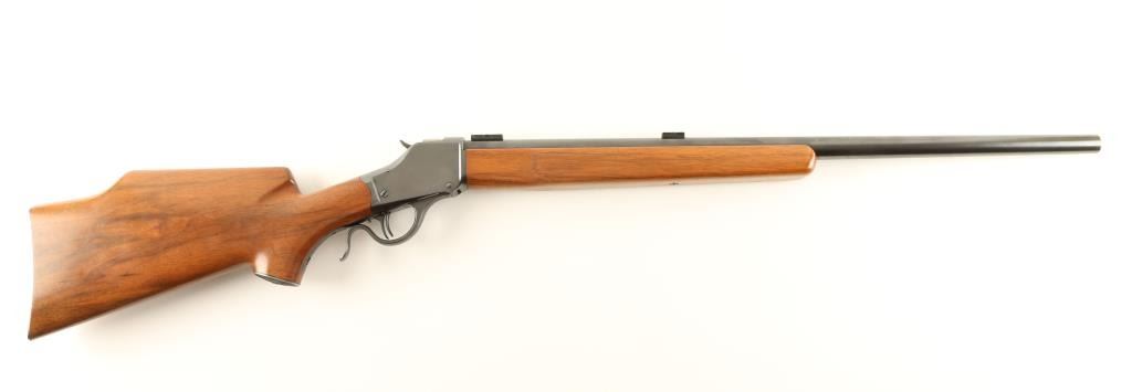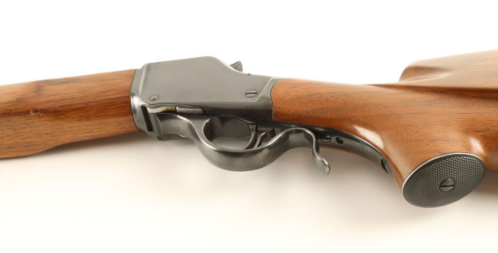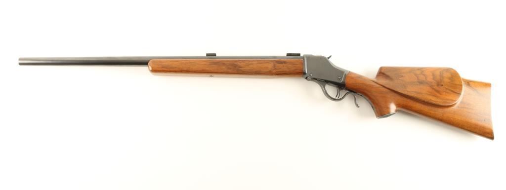 Finely crafted single shot falling block rifle chambered in .219 Zipper Improved, utilizing a 1898 vintage 'High Wall' receiver. The work was done by famous gunsmith C.C Johnson in 1961. Features a blued finish, heavy 26" barrel, no sights, installed scope blocks, double set triggers, checkered hammer spur, 's' shaped lever, no tang markings, smooth beaver tail select grade wood forend and high comb pistol grip shoulder stock with a cheek piece & checkered metal buttplate. Barrel is marked "219 IMP. ZIP./C.C.JOHNSON and is approx. No. 2 weight. Rifle exhibits 95% of it's custom blued finish with few minor losses and shows some light old pitting under the finish on the receiver. Action is smooth, bore is excellent and wood stocks are fine with few small blemishes. Condition is excellent. ***Antique Firearm***