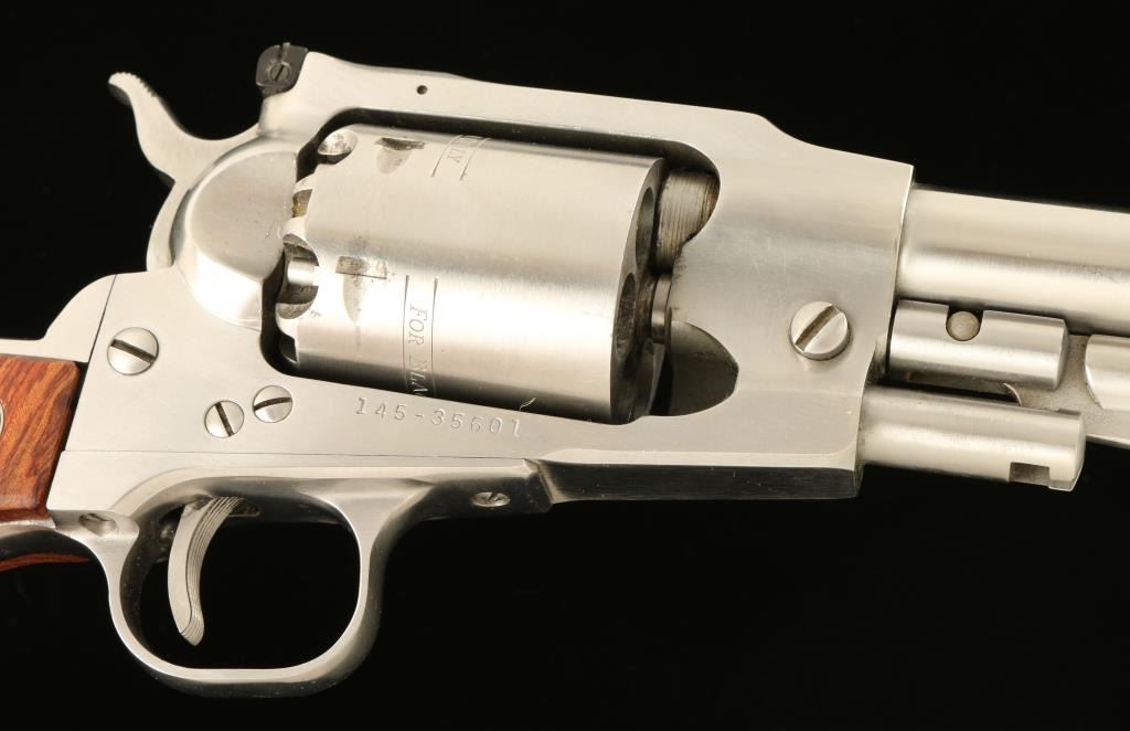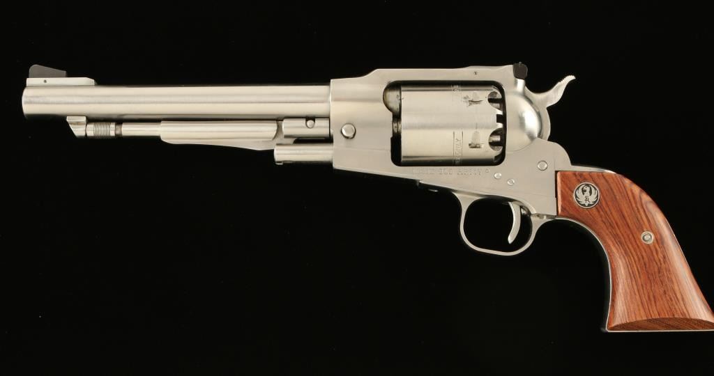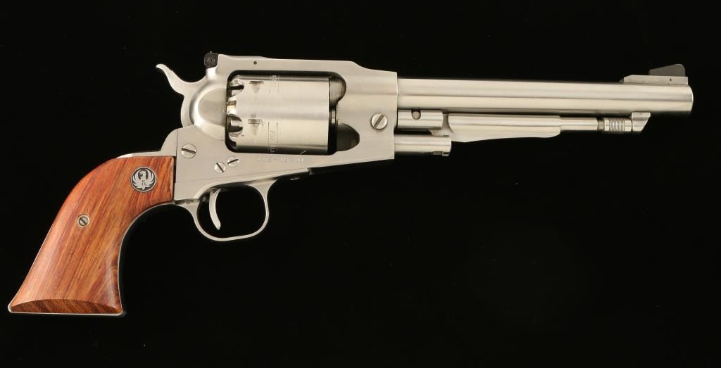Modern production single-action percussion revolver designed to be the most advanced and accurate cap and ball revolver ever made. Features a brushed stainless steel finish, 7.5" barrel, ramped & pinned front sight, adjustable rear window sight, loading lever, non-fluted six shot cylinder with safety stops, serrated trigger & hammer spur, and two piece Ruger medallion wood grips. Revolver shows light to moderate handling wear with superficial scratches and scuffs. Action is smooth, bore is excellent and woods grips are fine. Condition is very good+. ***Antique Firearm***