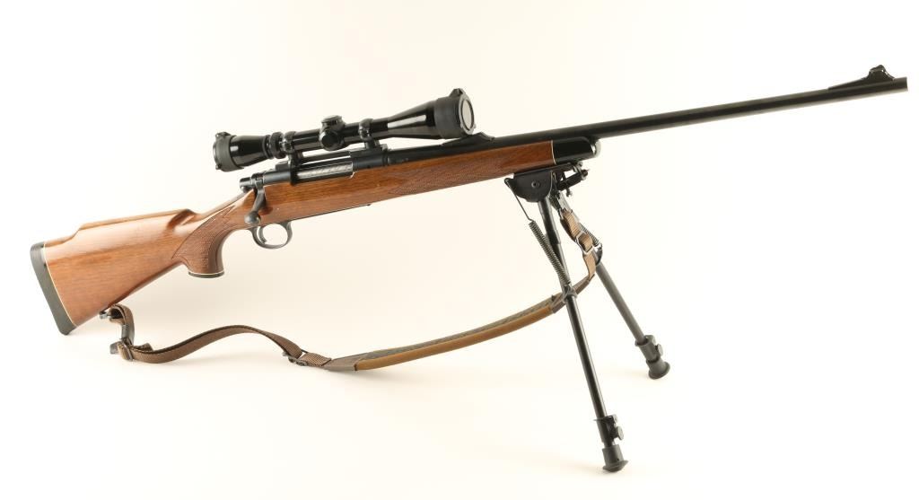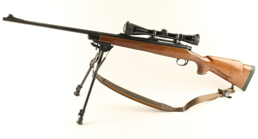 Bolt action centerfire hunting rifle chambered in .338 Winchester Magnum. Features a blued finish, 24" tapered barrel, ramped front sight, rear sight ramp with removed sight, Leupold Vari-X II 3-9x scope, Harris 12"-24" bipod, manual safety, checkered bolt handle, lightly serrated trigger, internal magazine with hinged floorplate, Uncle Mike's padded sling, high gloss Monte Carlo style stock with cut checkering, black forend cap, black pistol grip cap & rubber recoil pad. Rifle retains 94% of it's original finish showing some handling wear. Action is smooth, bore is excellent, wood stock is near fine and optics are clear. Condition is excellent. ***Modern Firearm***