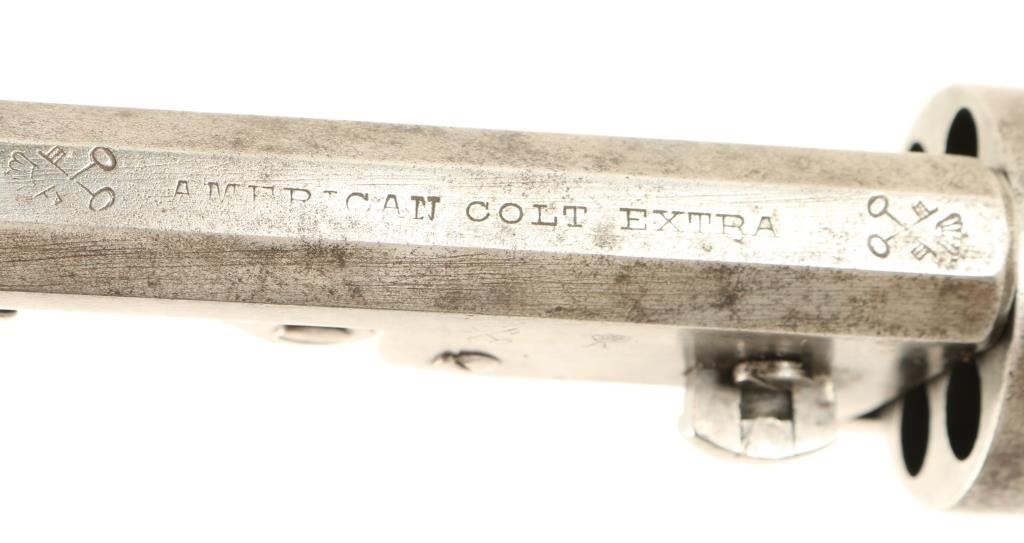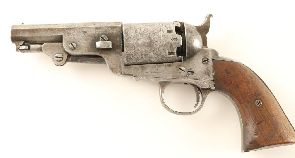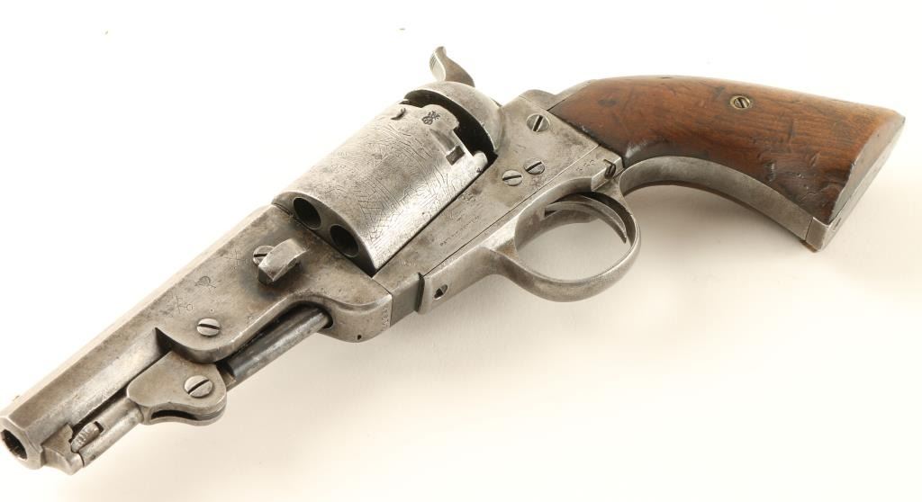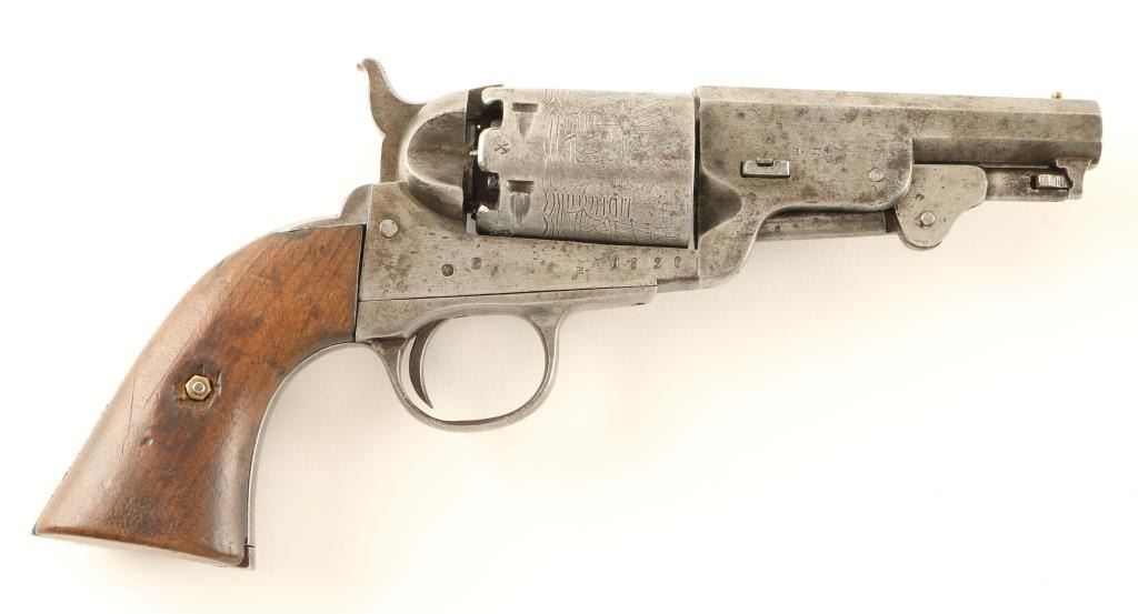 'American Colt Extra' Interesting percussion revolver replicating a Colt 1851 Navy. Features a blued finish, 3.8" octagonal barrel, brass bead front sight, no rear sight, loading lever, six shot non-fluted cylinder with roll stamped Brooklyn bridge scene, serrated hammer spur and two piece smooth walnut grips. The revolver has numerous proof marks including a Crown/R, Crown/Crossed Flags, Crown/A and more. A small amount of finish is evident in protected areas with the remained in the white with some dark oxidation and scattered pin prick pitting. Action is solid, bore is very good and wood grips are good+. Condition is good++. ***Antique Firearm***