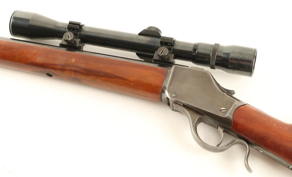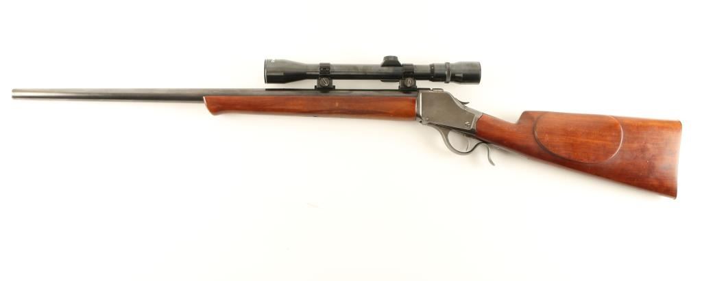 Custom built single shot falling block rifle chambered in .243 Winchester, utilizing a 1887 vintage 'High Wall' receiver. Features a blued finish, heavy 26" H. Lovell barrel, no sights, Challenger C9V 3-9x scope, smooth trigger, checkered hammer spur, 's' shaped lever, no tang markings, smooth schnabel wood forend and straight grip shoulder stock with a cheek piece & checkered metal buttplate. Rifle exhibits approximately 50% of it's custom finish showing spots of heavy wear on the top of the barrel under the scope and a browning patina. Action is smooth, bore is excellent and wood stocks are fine with few small blemishes. Condition is very good. ***Antique Firearm***