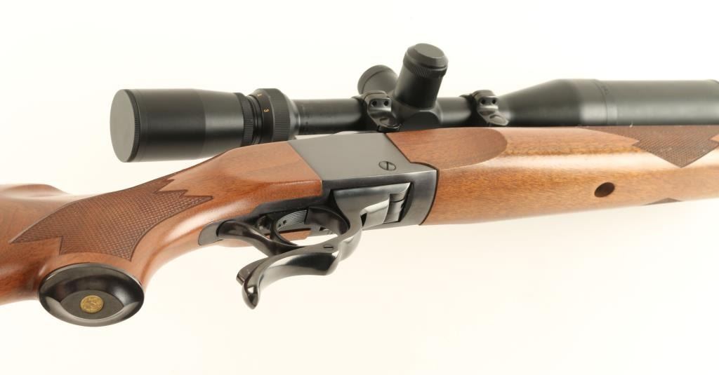 Falling block single-shot sporting rifle chambered in .204 Ruger, circa 2006. Features a blued finish, 22" tapered barrel, no sights, Weaver Tactical 3-9x scope, serrated trigger, sliding tang safety, swivel studes, checkered walnut forend, and pistol grip shoulder stock with metal grip cap & rubber recoil pad. Rifle exhibits 99% of it's original finish with little wear observed. Action is smooth, bore is pristine and wood stocks are fine. Condition is near excellent. ***Modern Firearm***