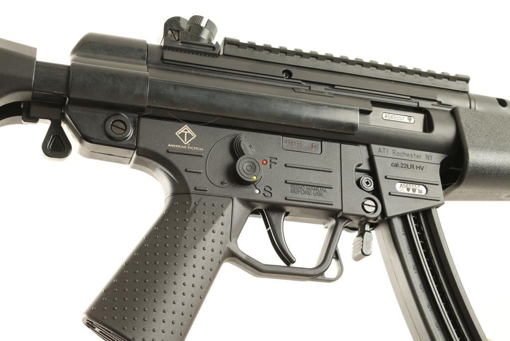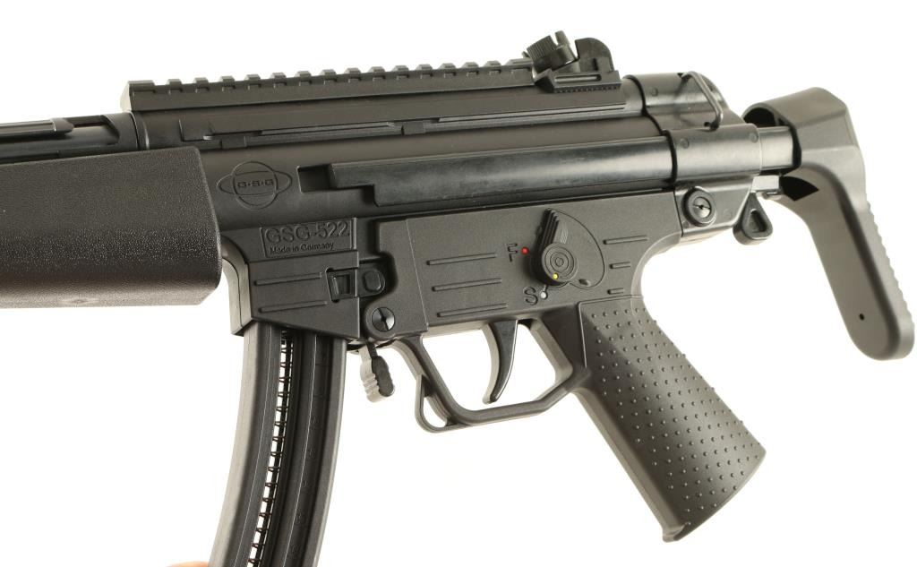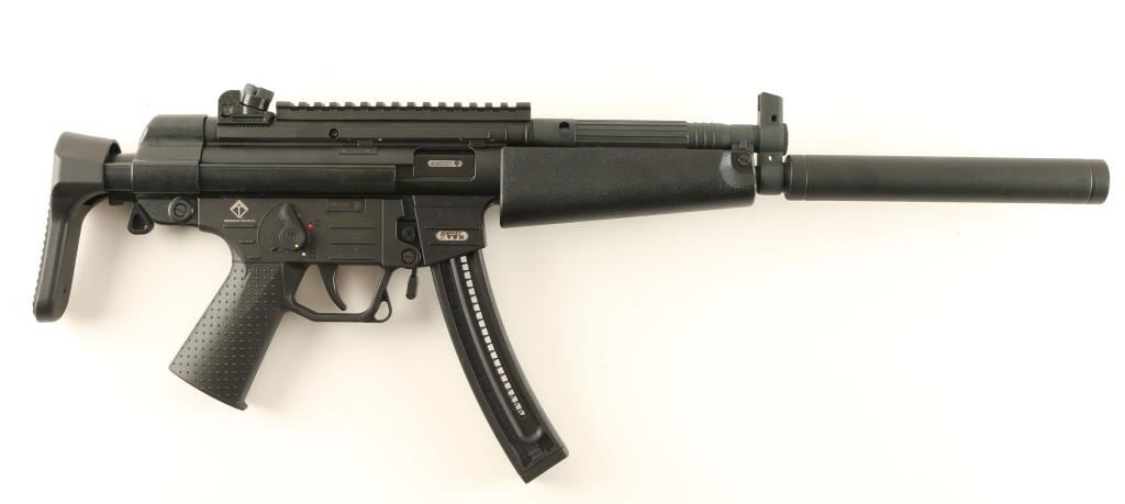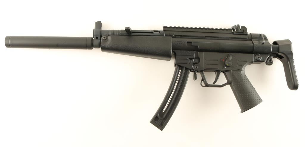 German made HK MP5SD5 replica chambered in .22 Long Rifle. Features a matte black finish, 16.25" barrel with faux suppressor, winged post front sight, variable rotating rear window sights, ambidextrous safety selector, 22 round magazine, accessory rail on the top of the receiver, black synthetic handguard, pebbled pistol grip and collapsible shoulder stock. Includes the original factory cardboard box with lock. Rifle shows minor handling wear with only a few scuffs. Action is smooth, bore is excellent and synthetic stocks are fine. Condition is excellent in box. ***Modern Firearm***