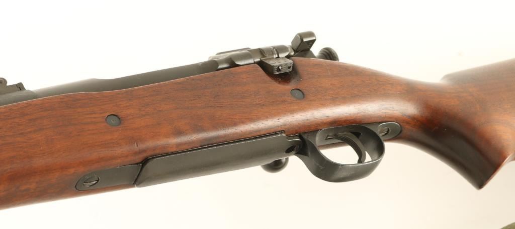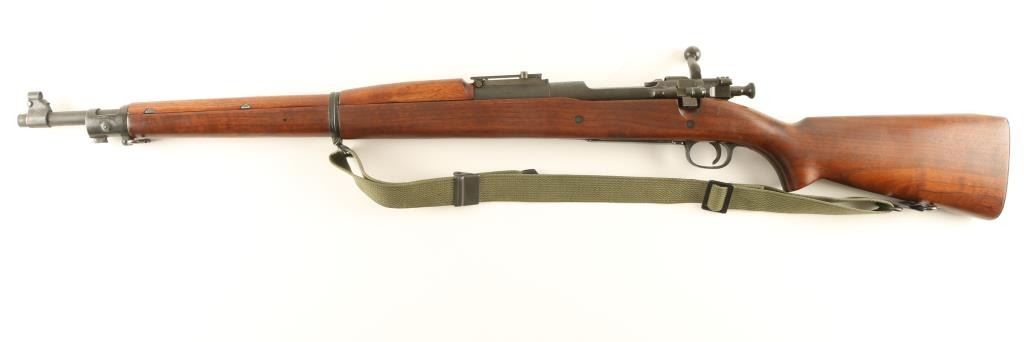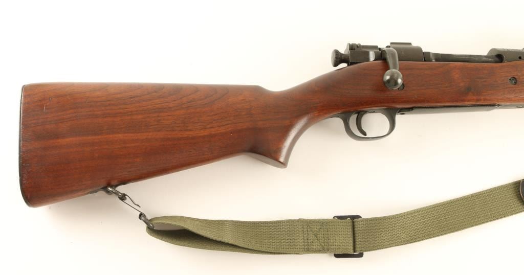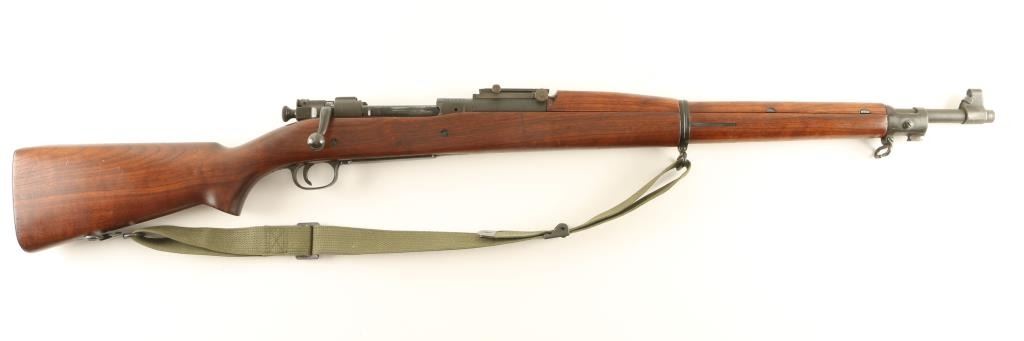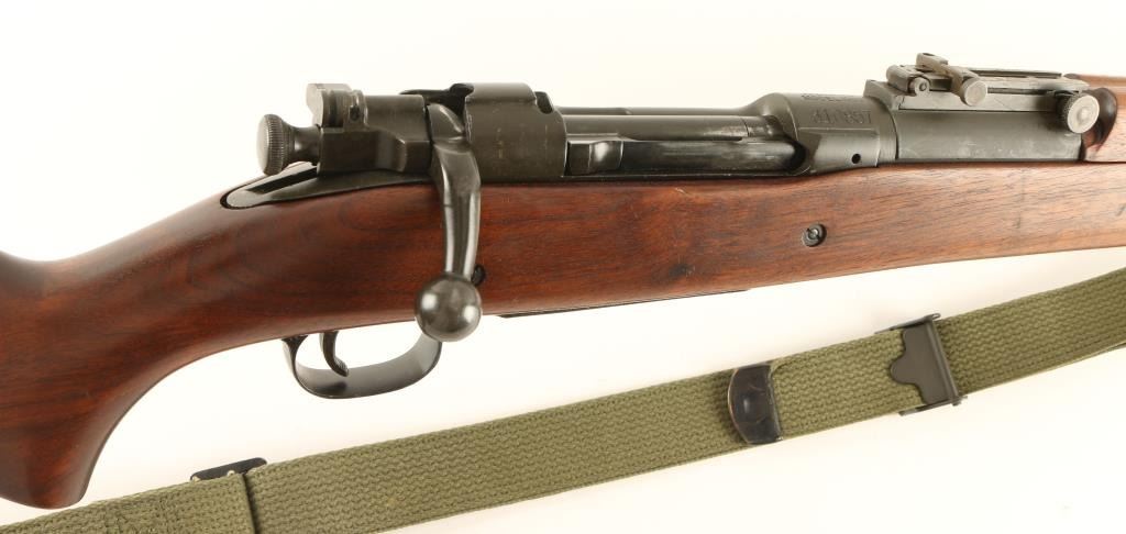 Rebuilt U.S. Military contracted bolt action service rifle chambered in .30-06 Springfield, circa 1918. Features a parkerized finish, 24" barrel marked "HS(flaming bomb)7-44", blade front sight with cover, adjustable rear sight graduated to 2,700 yards, integral five round box magazine with cut-off switch, bent bolt handle, safety switch on bolt, serrated trigger, two barrel bands - front with bayonet lug, green canvas sling, smooth metal trapdoor buttplate, smooth full-length walnut handguard and pistol grip shoulder stock stamped "D1836-4". Rifle retains approximately 94% arsenal refinish with light wear. Action is smooth, bore is pristine, and wood stocks are fine. Condition is excellent. ***C&R Firearm*** ***Modern Firearm***