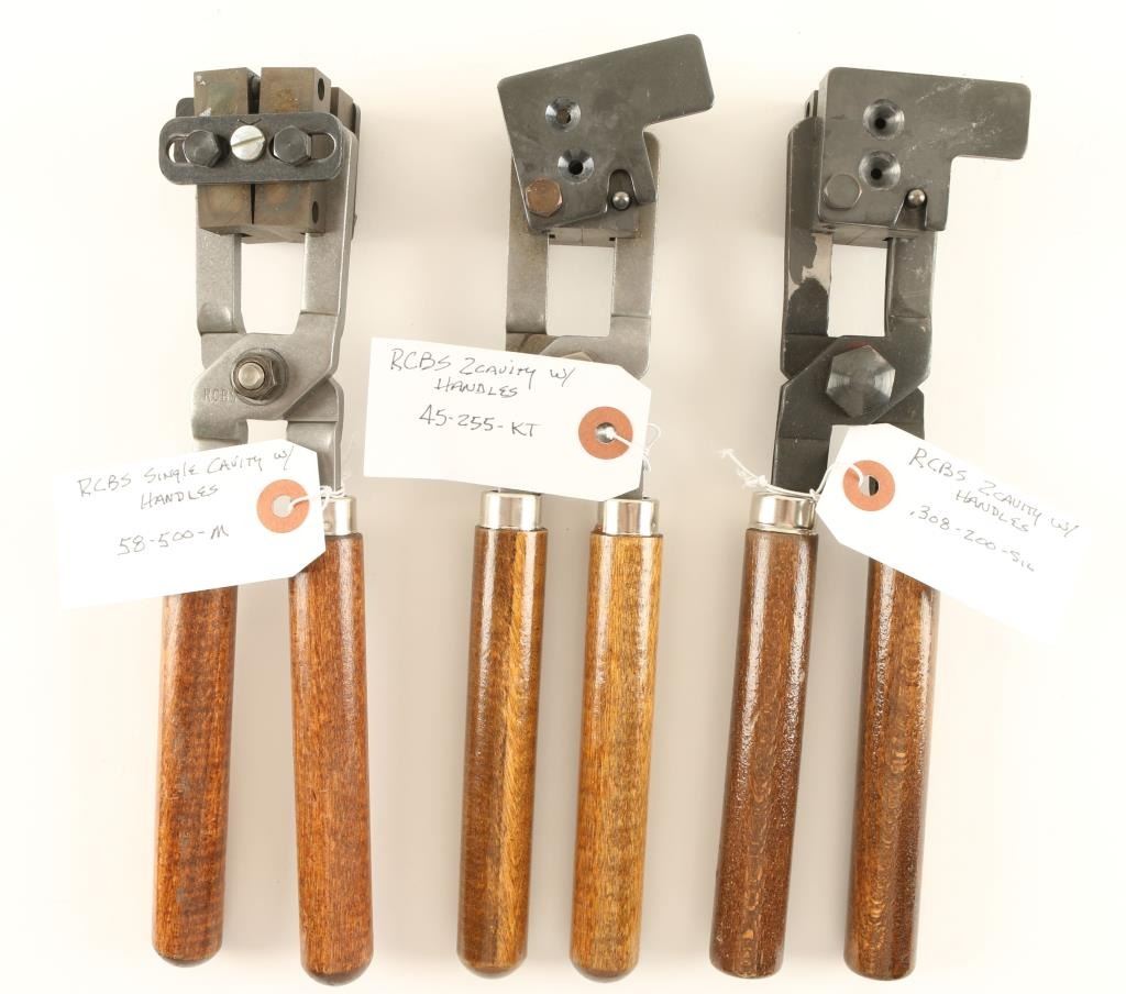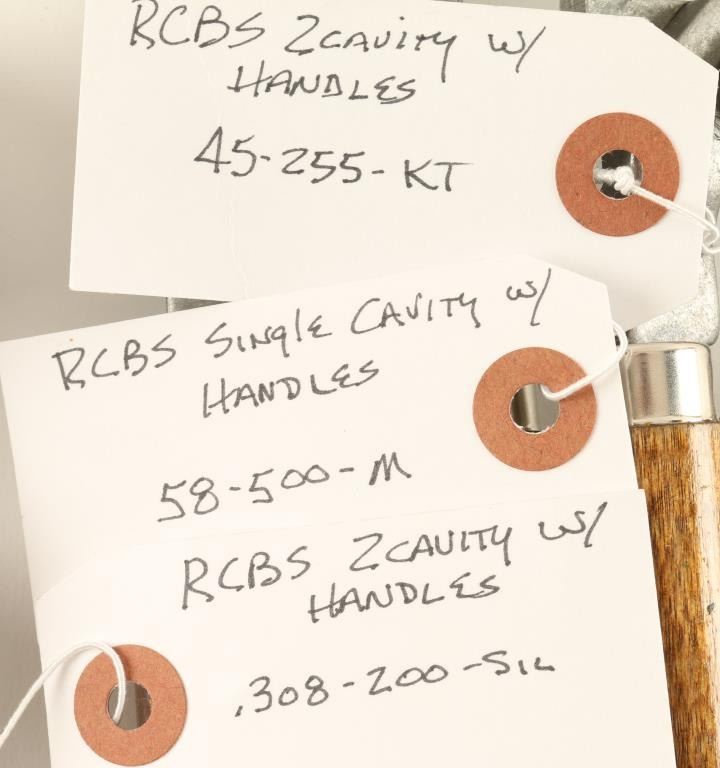 Includes a RCBS single cavity 58-500M with wooden handles, a RCBS two cavity .45-255KT with wooden handles, and a RCBS two cavity .308-200 SIL with wooden handles.