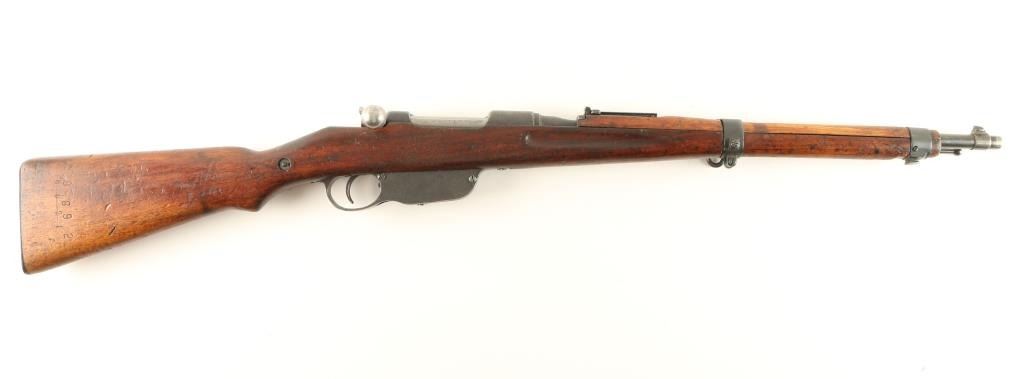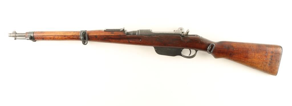 Austrian military straight pull bolt action carbine chambered in 8x56Rmm. Features a blued finish, 19.75" blued barrel stamped "S",blade front sight, flip-up elevation rear sight, sling swivels, bayonet lug, stacking hook, metal buttplate, manual safety, and smooth wood stock. Rifle retains approximately 30% of it's blued finish with dark scattered oxidation. Bore is good, action is firm and wood stocks are fair to good baring several ding & an old chip near the left side of the receiver. Condition is near good. ***Modern Firearm***
