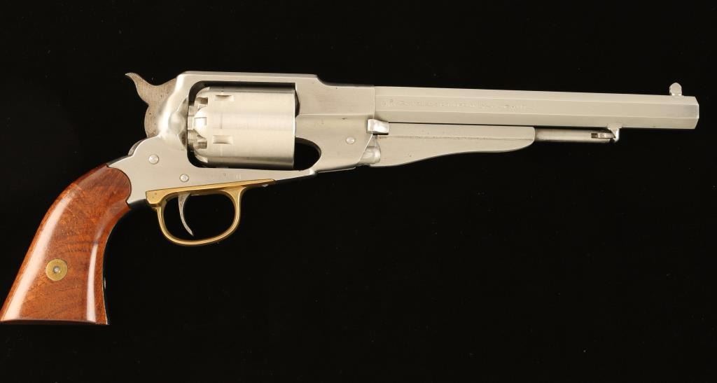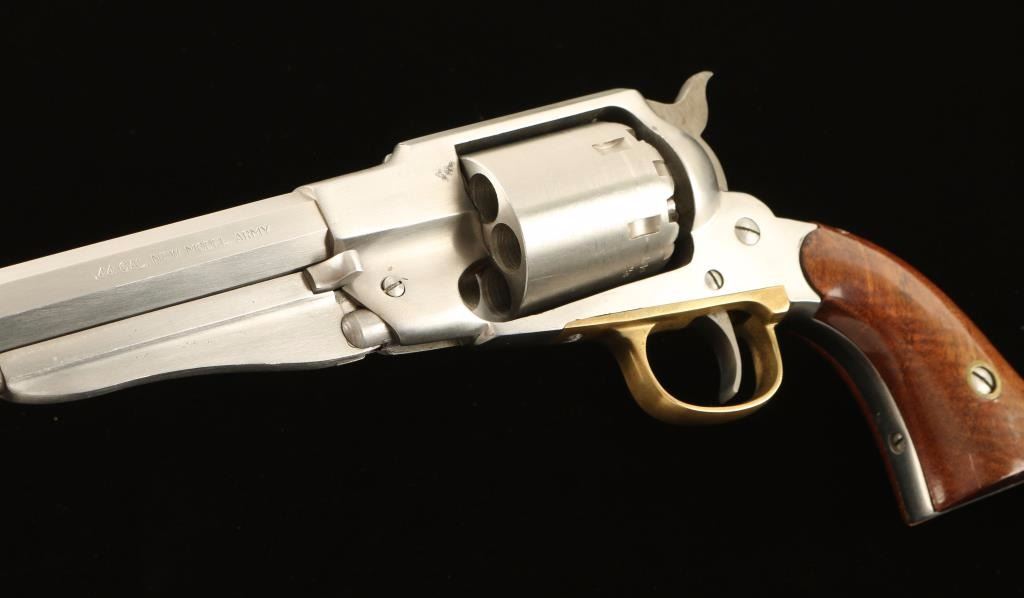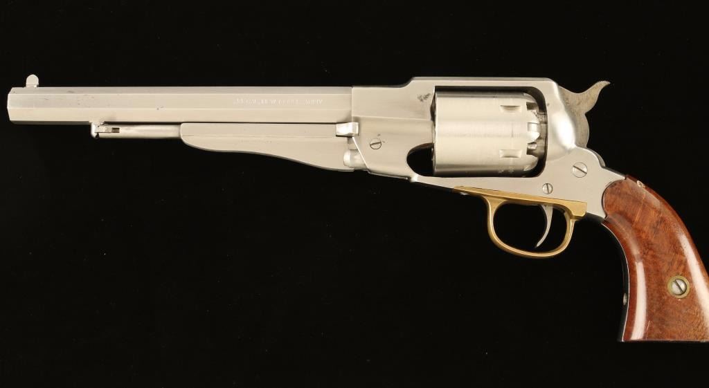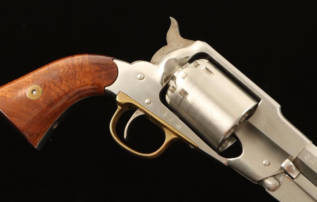 Italian made stainless steel replica percussion revolver chambered for .44 caliber ammunition, circa 1988. Features a brushed finish, 8" octagonal barrel, pinched post front sight, loading lever, six shot non-fluted cylinder, brass trigger guard, serrated hammer spur, and two piece varnished wood grips. Revolver exhibits a small area of dark oxidation and moderate handling marks with no major wear. Action is smooth, bore is clear and wood grips are near fine. Condition is very good++. ***Antique Firearm***
