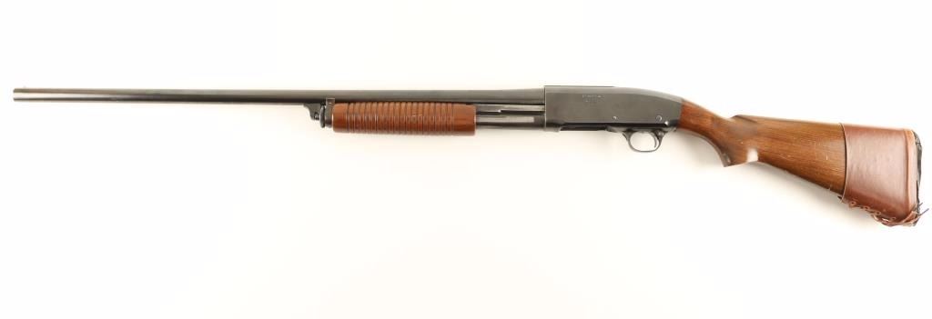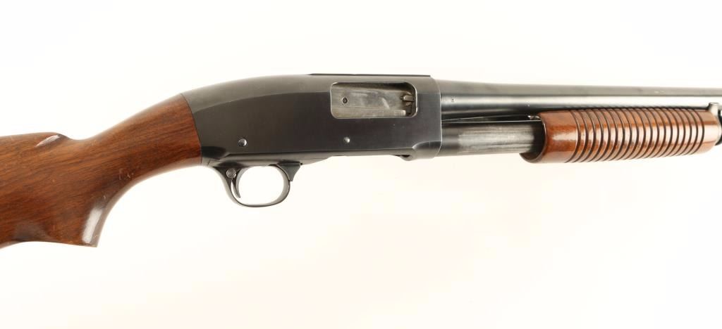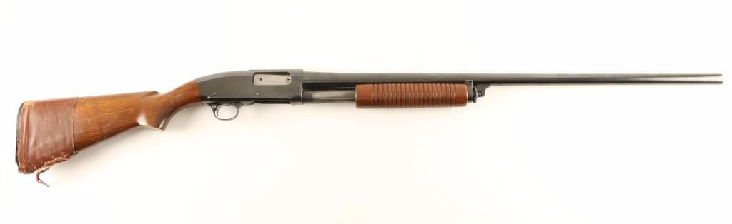 Vintage slide action repeating shotgun chambered for 2 3/4" 12 gauge shells, circa 1930's-1940's. Features a blued finish, 30" take-down barrel, bead front sight, 1/2 tube magazine, smooth trigger, push button safety, grooved walnut slide handle and pistol grip shoulder stock leather pad. Shotgun exhibits approximately 90% of it's blued finish with most the wear on the tube magazine and some scattered small losses on barrel. Action is smooth, bore is bright and wood stocks are very good. Condition is very good+. ***C&R Firearm*** ***Modern Firearm***