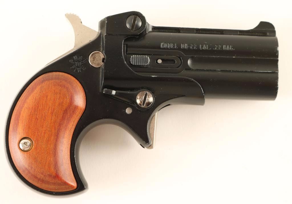 Over & Under double barrel derringer chambered in .22 Magnum. Features a black finish, 2.4" barrels, fixed sights, extractor, serrated trigger spur, push button safety, auto rotating barrel selector on hammer, spur trigger, and two piece wood grips. Includes original factory box with documents. Derringer exhibits 90% of it's black finish with light edge wear and some handling marks. Action is crisp, bores show debris, and wood grips are fine. Condition is very good in box. ***Modern Firearm***