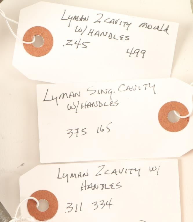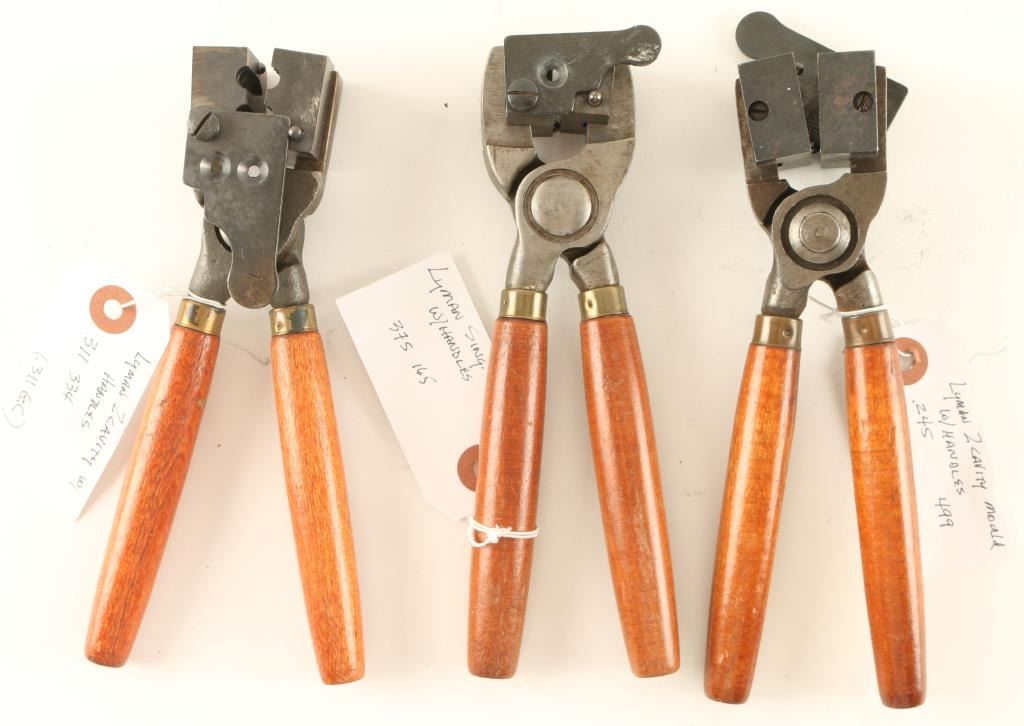 Includes a Lyman 2 cavity .311-334 mold, a Lyman single cavity .375-165 mold, and a Lyman 2 cavity .245-499 mold, all with wooden handles.