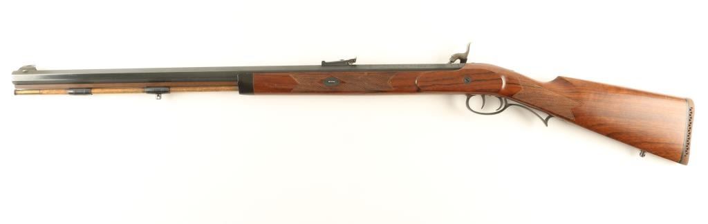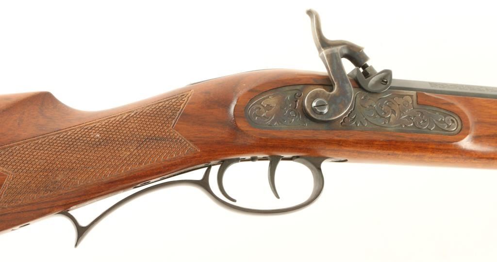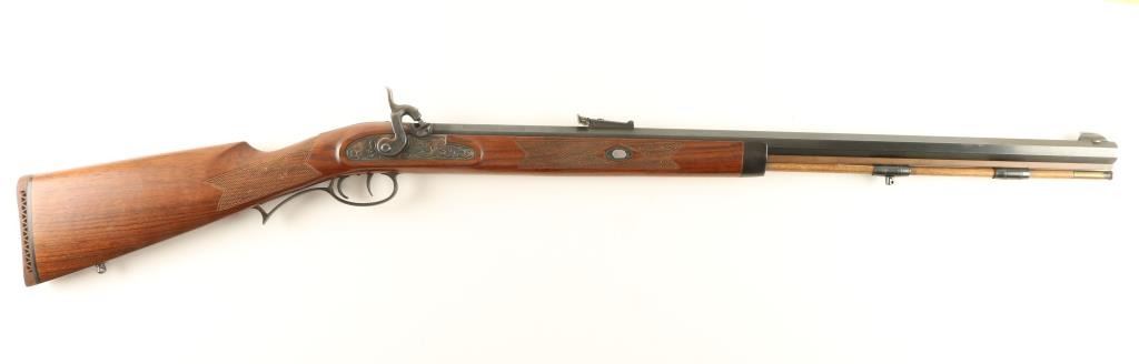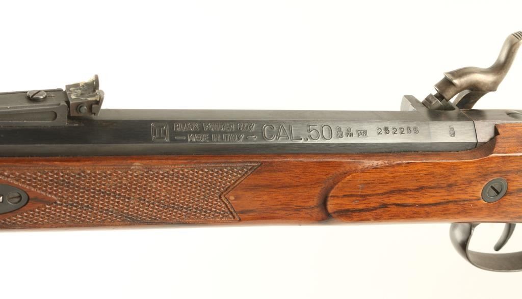 Italian made reproduction percussion plains rifle chambered for .50 caliber ammunition. Features a heavy 29" octagonal barrel, large blade front sight, adjustable rear sight, wood ram rod with brass tip, case hardened lock, double set triggers, swivel studs and a checkered one piece walnut shoulder stock with rubber recoil pad. Rifle retains approximately 95% of it's original finish with some light handling wear and a small amount of dark rust near the rear sight & around the nipple. Action performs well, bore is clear and wood stock is near fine with a few small blemishes. Condition is near excellent ***Antique Firearm***