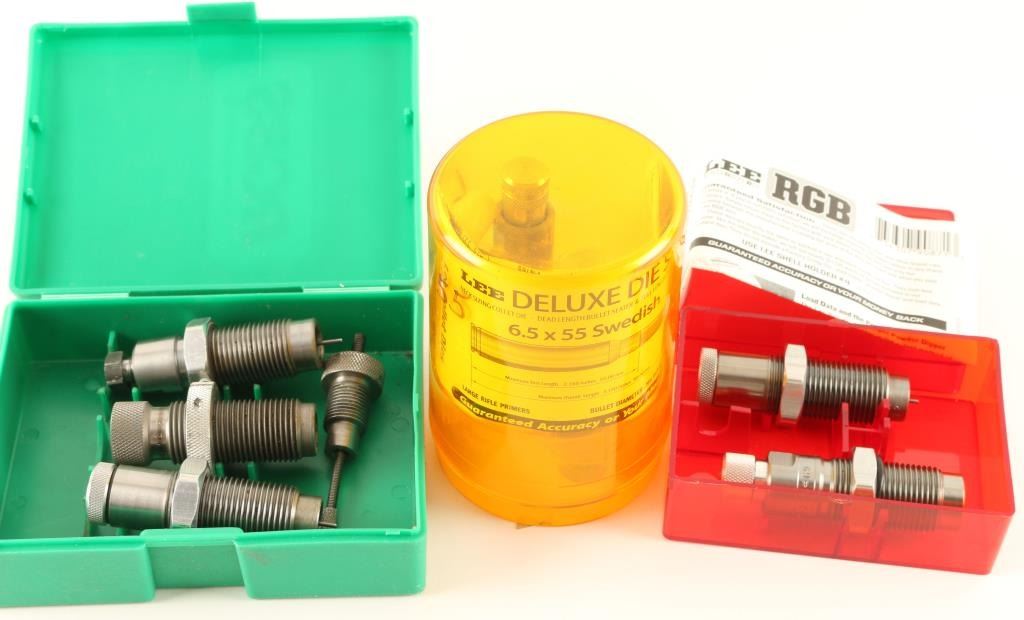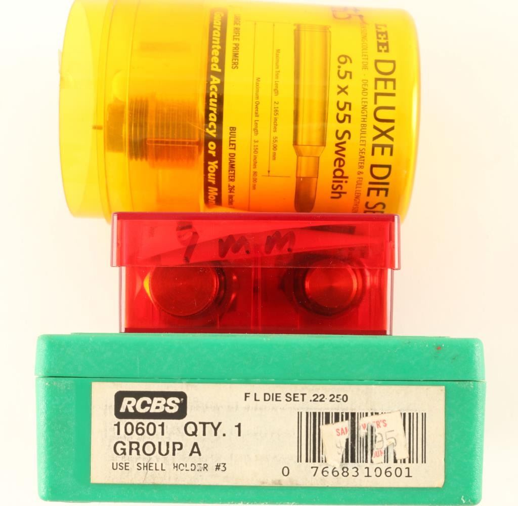 Includes a 6.5 x 55 Lee Deluxe Die Set, a Lee RGB .223 REM Reloading Dies, and an RCBS .22/250 F.L. Die Set.