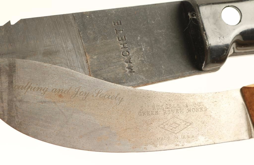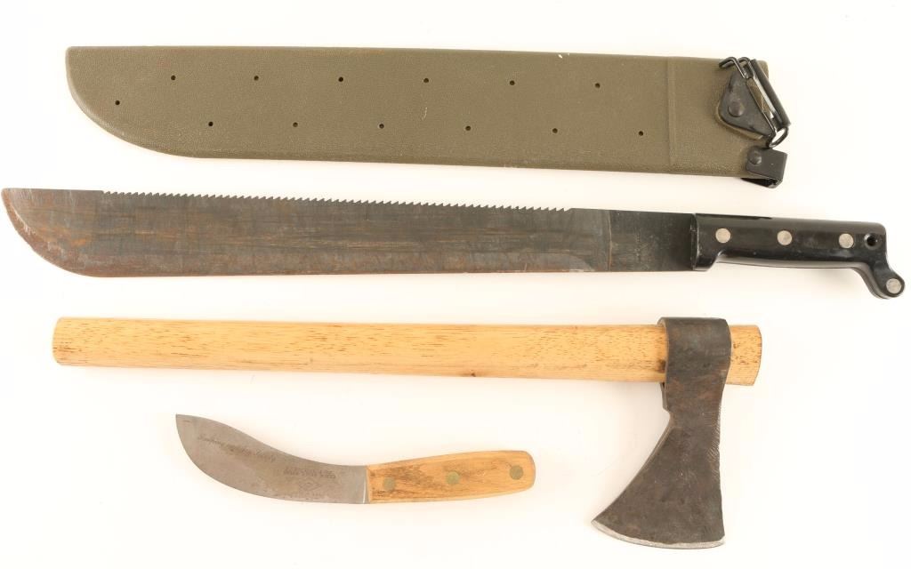 Includes a Machete measuring 23" overall with a 16" blade and hard plastic sheath, an Ax, and a J. Russell Co. Green River Works knife measuring 9" overall with a 5" blade.