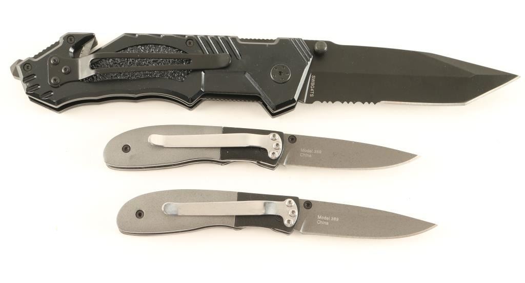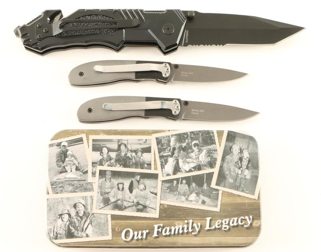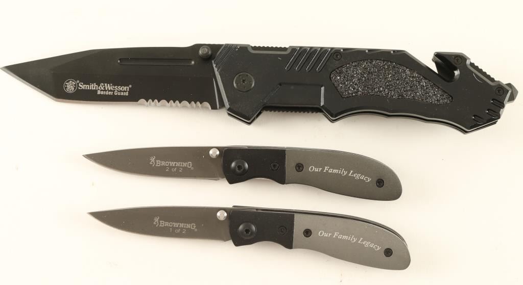 Including a matched set of 2 Browning 'Our Family Legacy' single blade pocket knives and one Smith & Wesson single folding blade knife. Both new in boxes.