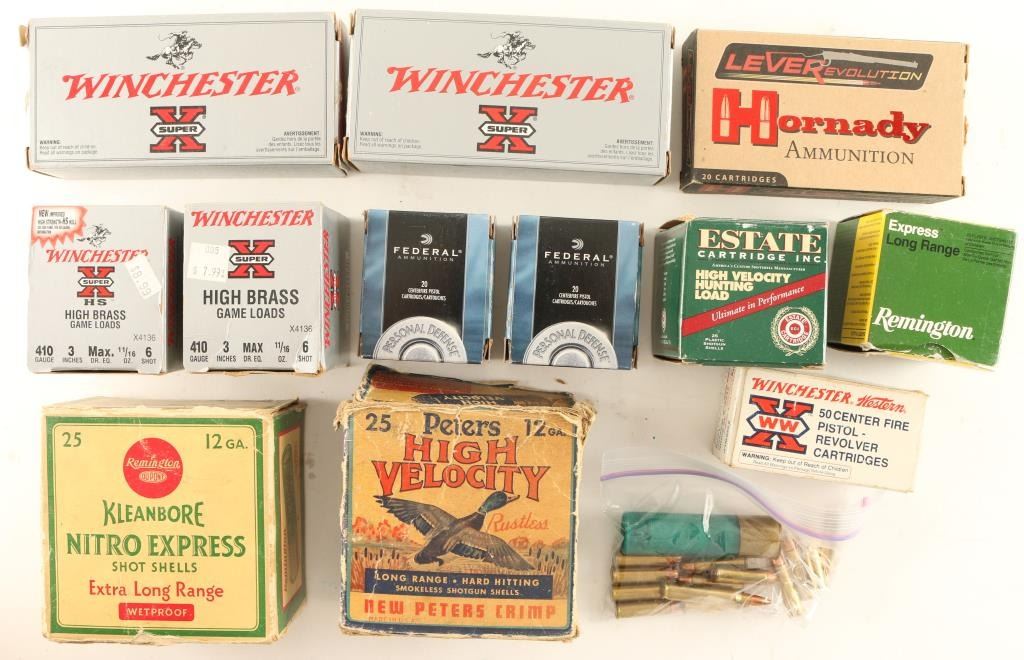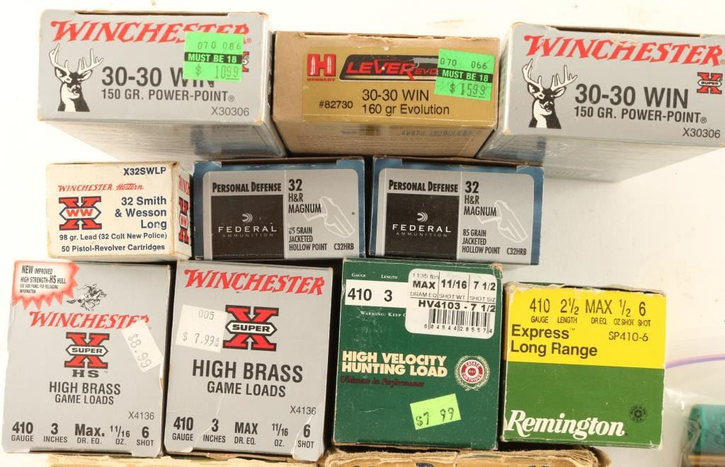 Including 60 rds of 30-30 Win., 40 rds of .32 H&R Mag, approx 75 rds of .410 Win High Brass Game Loads, approx. 35 rds of .12 Ga Shells, 15 rds of .410 Express Long Range, 40 rds of .32 S&W Long, and more.