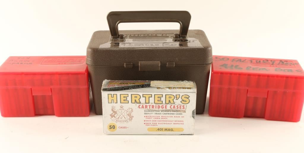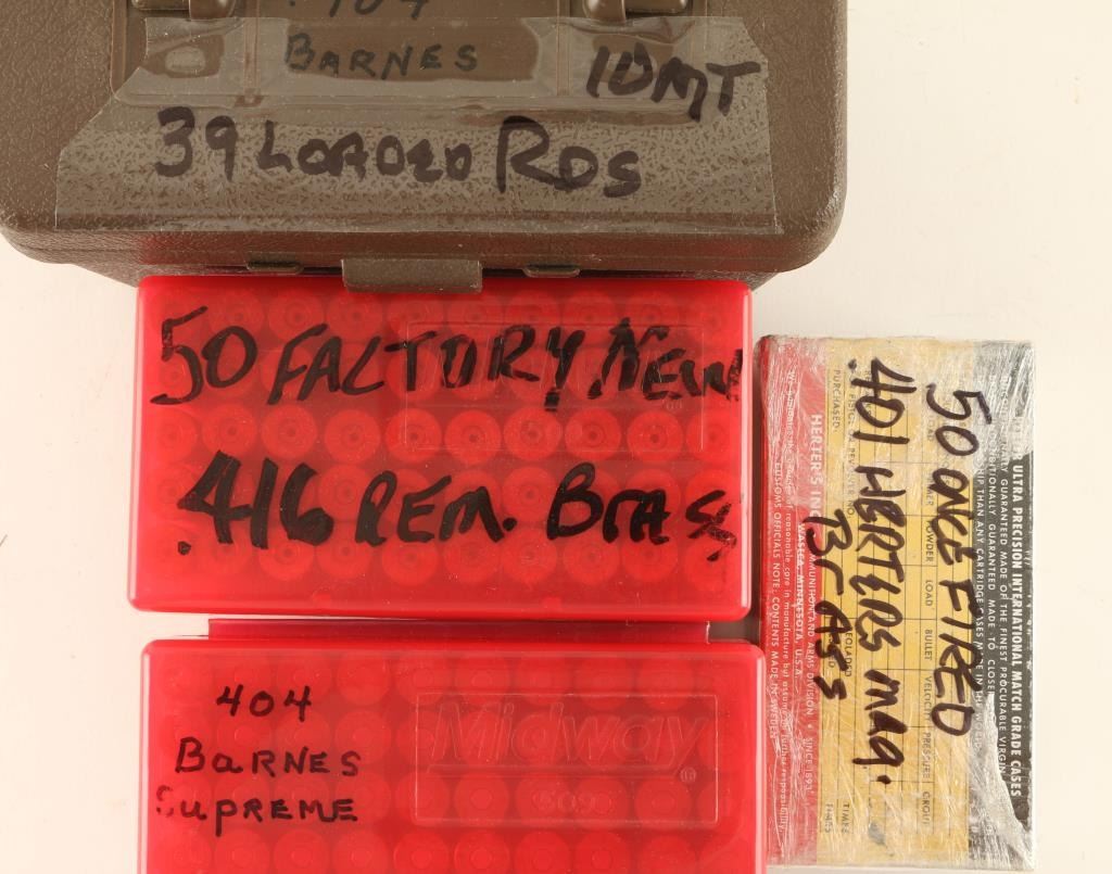 Including 50 rds of Herter's .401 Mag brass, 60 rds of .404 brass, 39 rds of loaded .404, and 50 rds of factory new .416 REM brass.