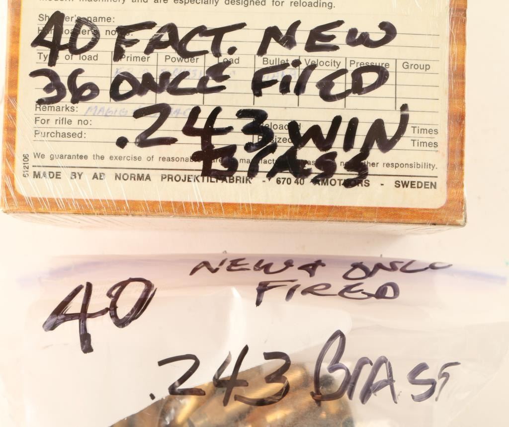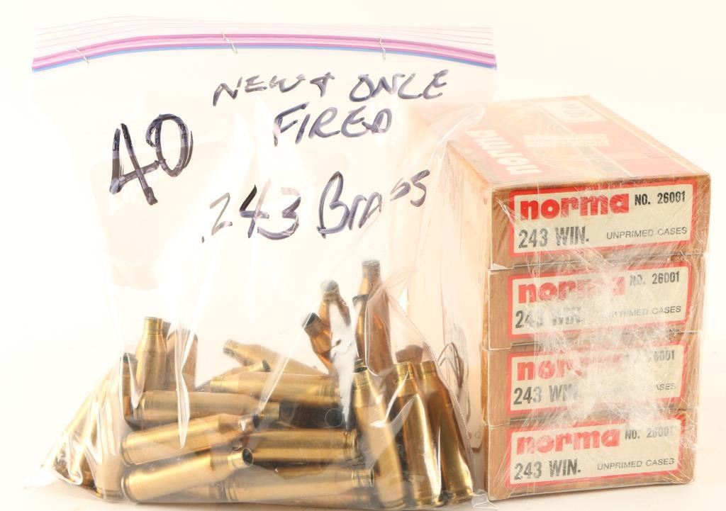 Including 40 rds of factory new Norma .243 Win brass and 76 rds of once fired .243 Win brass