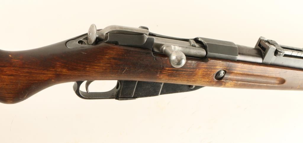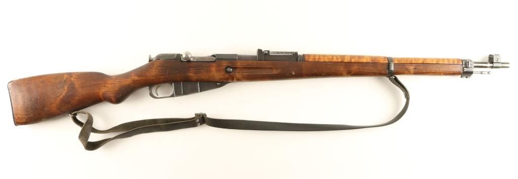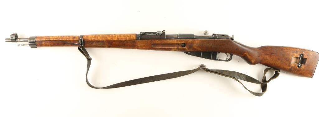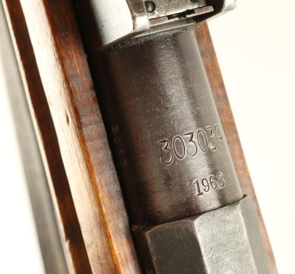 Finnish post-war production bolt action rifle chambered in 7.62x54R, circa 1968. Features a blued finish, 27" tapered barrel, winged front sight, graduated rear sight to 1,000 meters, hinged front barrel band with bayonet lug, cleaning rod, leather sling, octagonal receiver, straight bolt handle, internal box magazine, smooth wood handguard and finger-jointed semi pistol grip shoulder stock with metal buttplate. Serial numbers match on barrel, receiver and bolt handle. Import marks on barrel. Rifle retains approximately 70% of it's blued finish, showing light old pitting on the magazine. Action is smooth, bore is semi-bright with good rifling, and later style wood stocks are very good with a small chip & old repairs. Condition is good+. ***Modern Firearm***