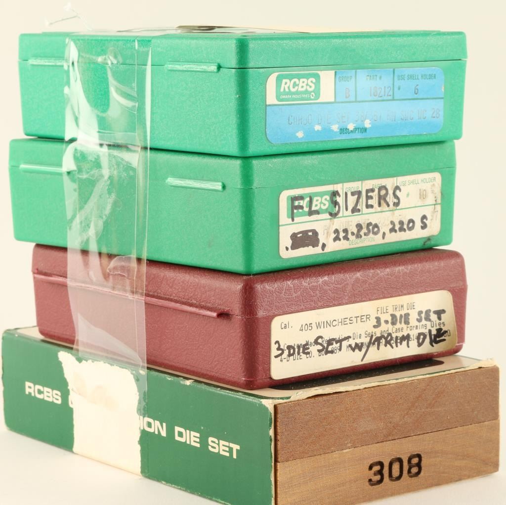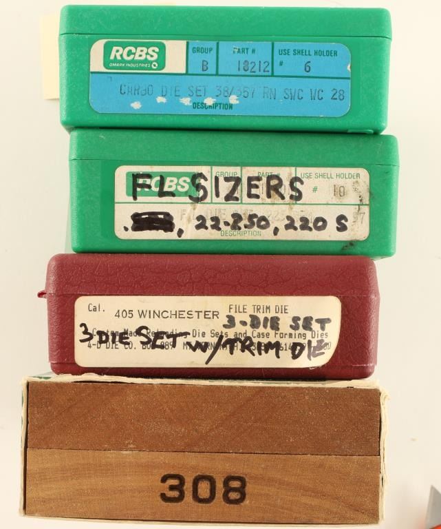 Including 38/357 RN SVC WC 28 die set, .405 WIN die set w/ trim die, .308 die set, and FL Sizers for .22-250 & .220 S.