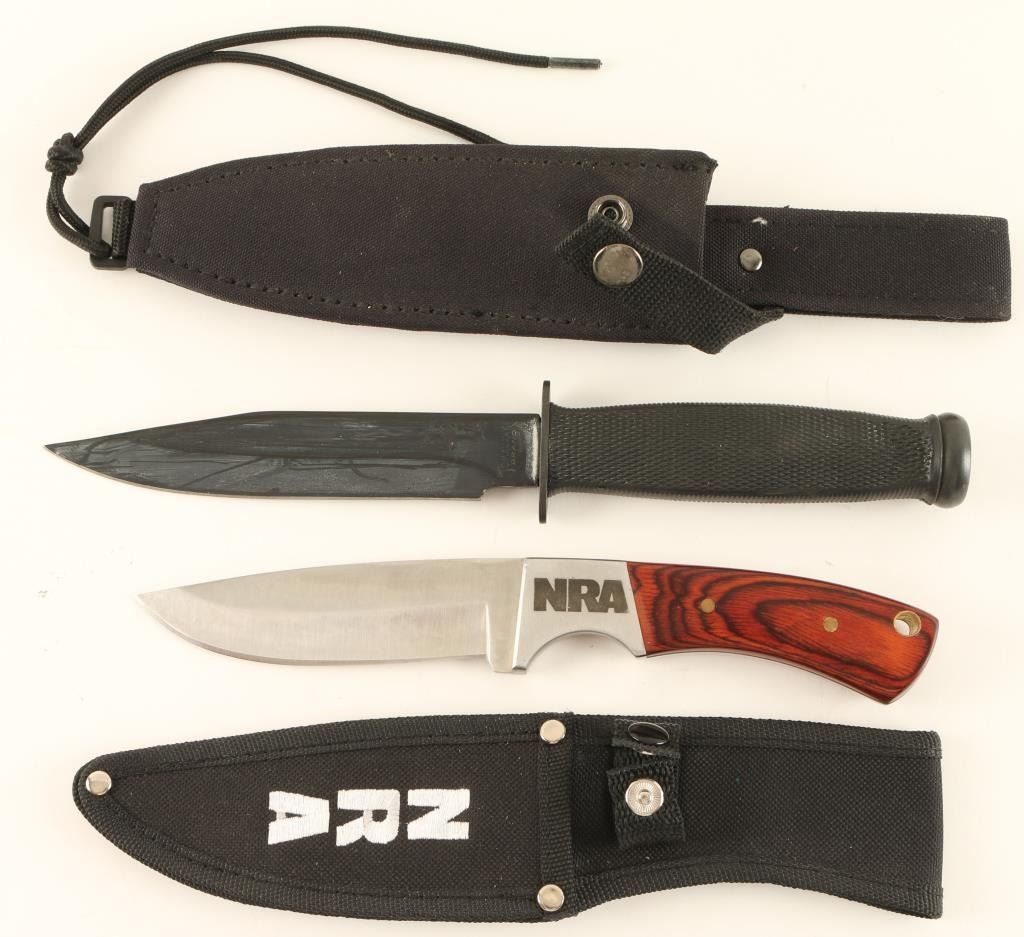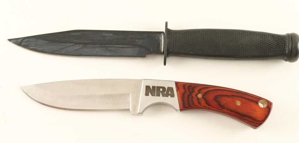 (1) NRA commerative skinner with wood handle with sheath measures 9 1/2" with a 4 1/2" blade. (1) Tommahawk Brand hunting knife with black rubber handle and blade meaures 11" overal with a 5 1/2" blade.