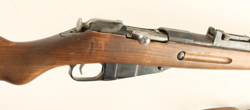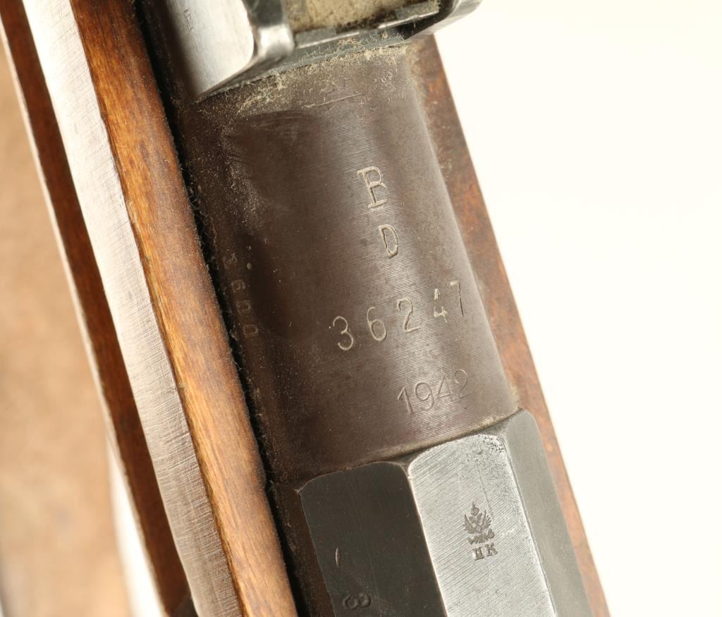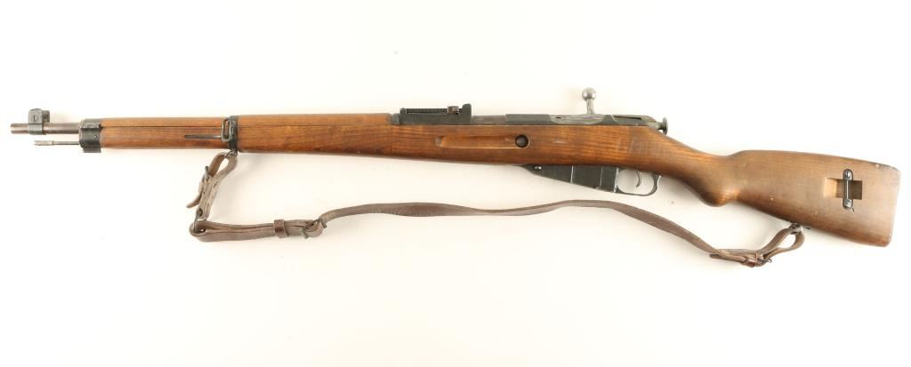 Finnish Military bolt action service rifle chambered in 7.62x54R, circa 1942. Features a blued finish, 'B' marked 27" barrel, winged front sight, graduated rear sight to 1,000 meters, hinged front barrel band with bayonet lug, cleaning rod, brown leather sling, octagonal receiver, straight bolt handle, internal box magazine, smooth wood handguard and finger-jointed semi pistol grip shoulder stock with metal buttplate. Serial numbers match on barrel, receiver and bolt handle. Import marks on barrel. Rifle retains approximately 80% of it's finish with the barrel turning plum. Action is smooth, bore is excellent, and later style wood stocks are near fine. Condition is very good+. ***C&R Firearm*** ***Modern Firearm***