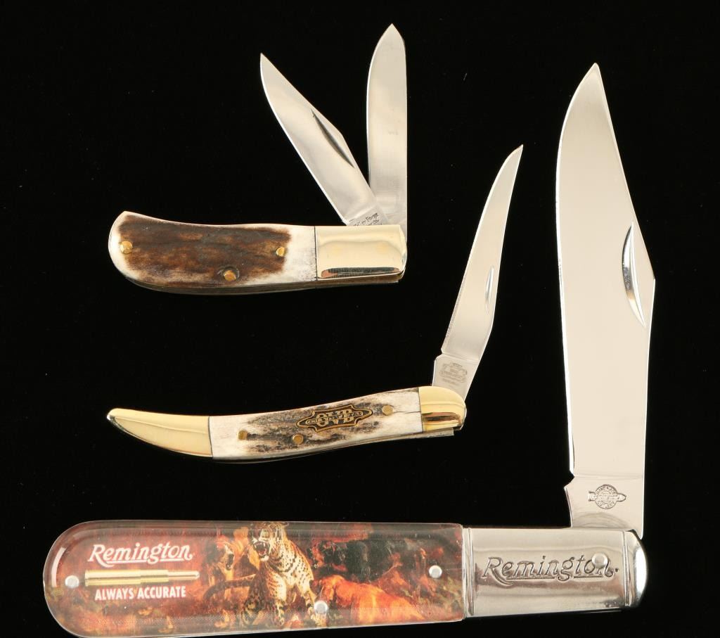 Includes a Valley Forge Cutlery 'Trapper' 2 1/2" multi blade pocket knife, a Remington Vintage Series single blade pocket knife, and a Hibbard Spencer-Barrett single blade pocket knife.