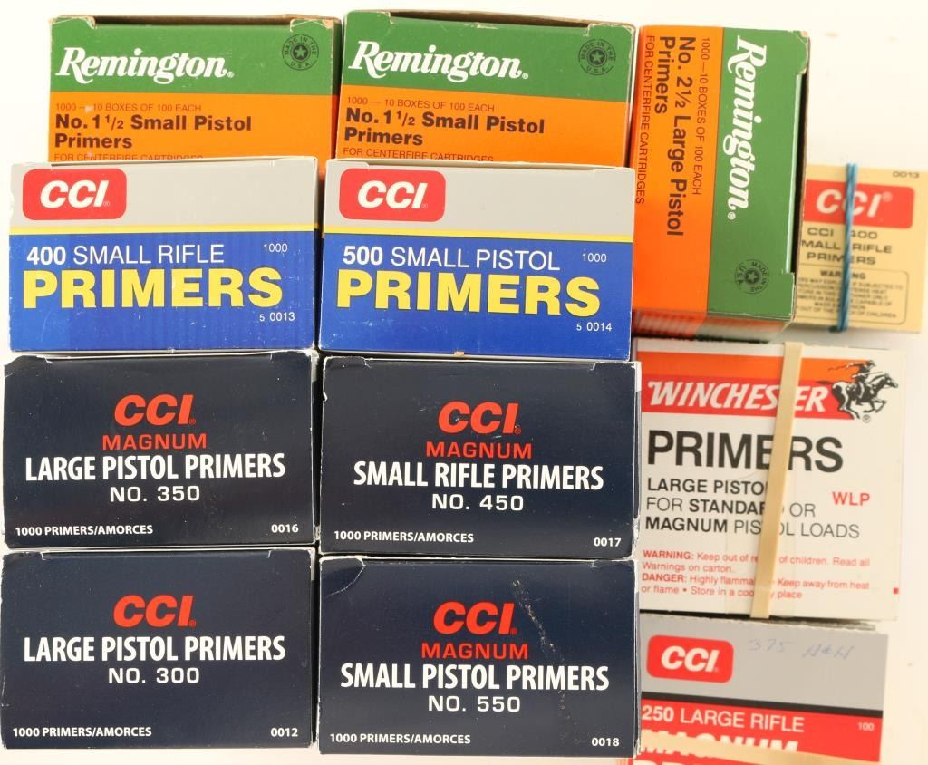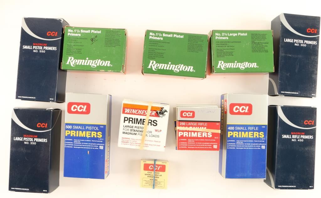 Includes approx. 2400 large rifle primers, approx. 600 small rifle primers, approx. 4500 small pistol primers, and approx 3000 large pistol primers.