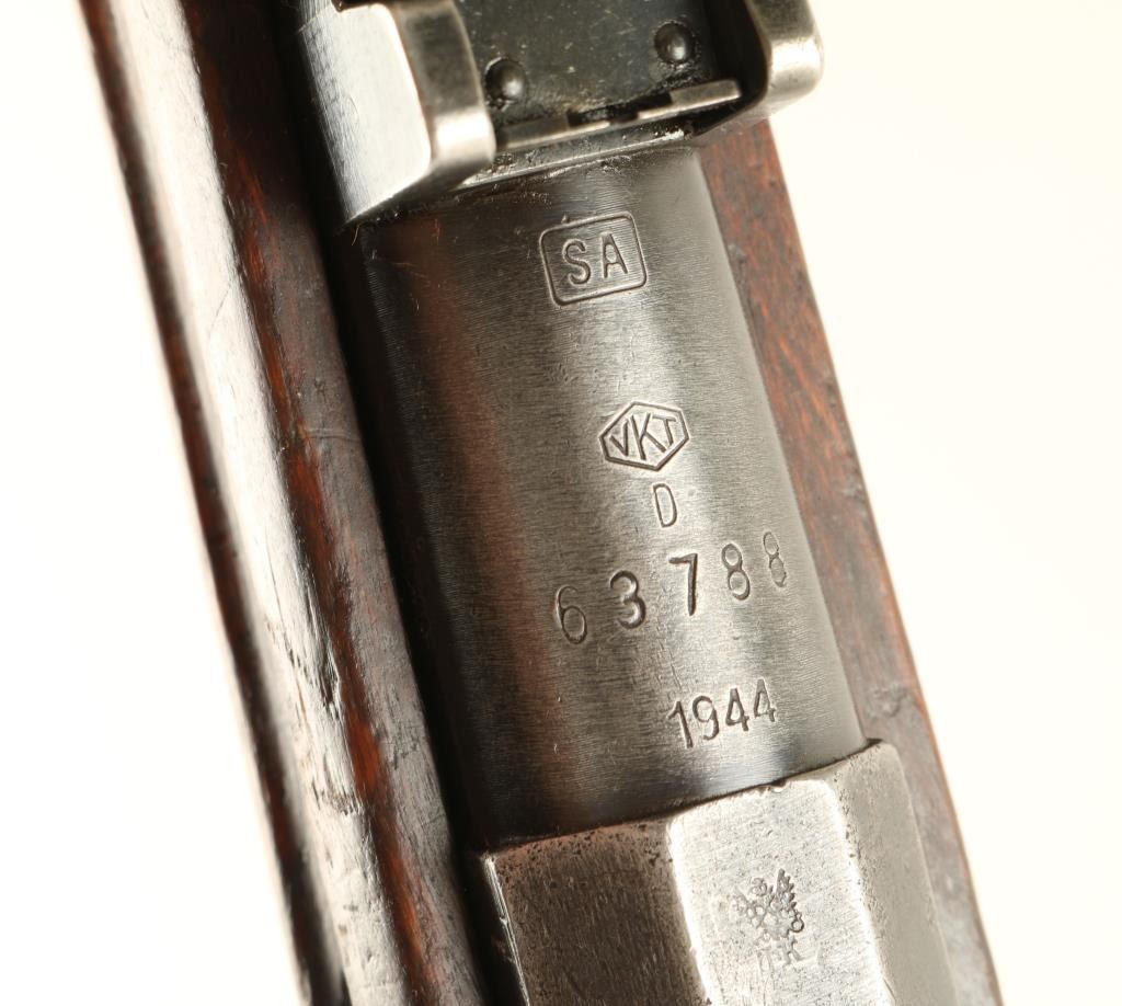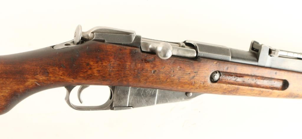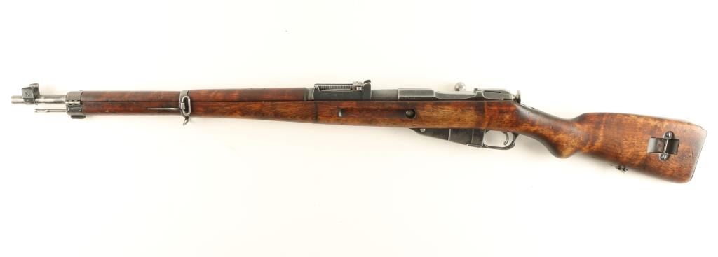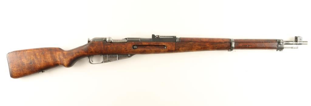 Finnish Military bolt action service rifle chambered in 7.62x54R, circa 1944. Features a blued finish, VKT marked 27" barrel, winged front sight, graduated rear sight to 1,000 meters, hinged front barrel band with bayonet lug, sling swivels, cleaning rod, octagonal receiver, straight bolt handle, internal box magazine, smooth wood handguard and finger-jointed semi pistol grip shoulder stock with metal buttplate. Serial numbers match on barrel, receiver and bolt handle. Import marks on barrel. Rifle retains approximately 60% of it's dulling blue finish. Action is smooth, bore is semi-bright with good rifling, and wood stocks are very good. Condition is good+. ***C&R Firearm*** ***Modern Firearm***