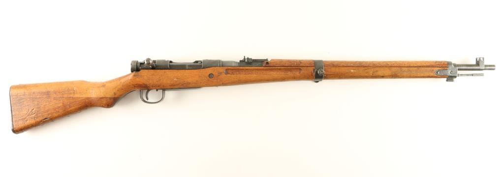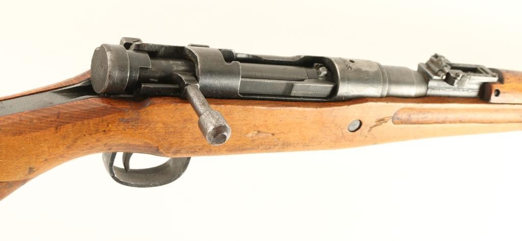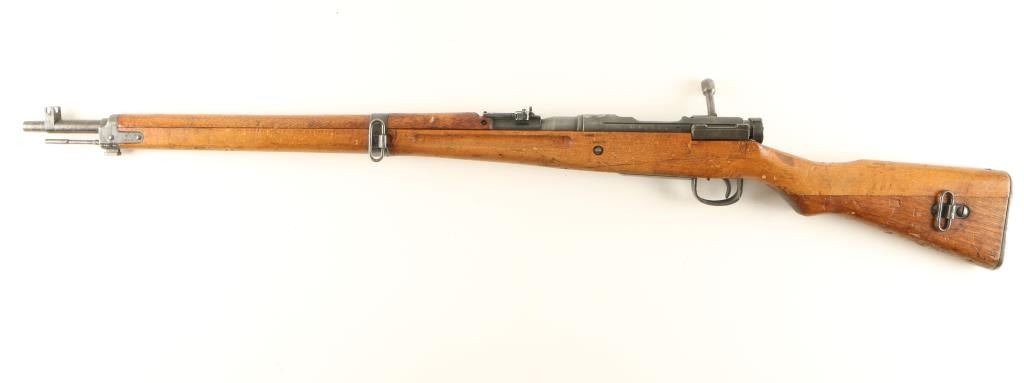 Late WWII Era Japanese Military rifle chambered in 7.7mm. Features a 26" barrel, winged blade front sight, adjustable rear ladder sight, ground mum, cylindrical bolt handle, bayonet lug, sling swivels, cleaning rod, metal buttplate, Nagoya Arsenal marking, integral box magazine. wood handguard and one piece pistol grip shoulder stock. Rifle retains approximately 60% of it's blued finish showing even wear and light surface rust & pitting on the barrel toward the muzzle. Action is strong, bore is bright with soft rifling and wood stocks are good with small losses, dings & cracks. Condition is good. ***C&R Firearm*** ***Modern Firearm**