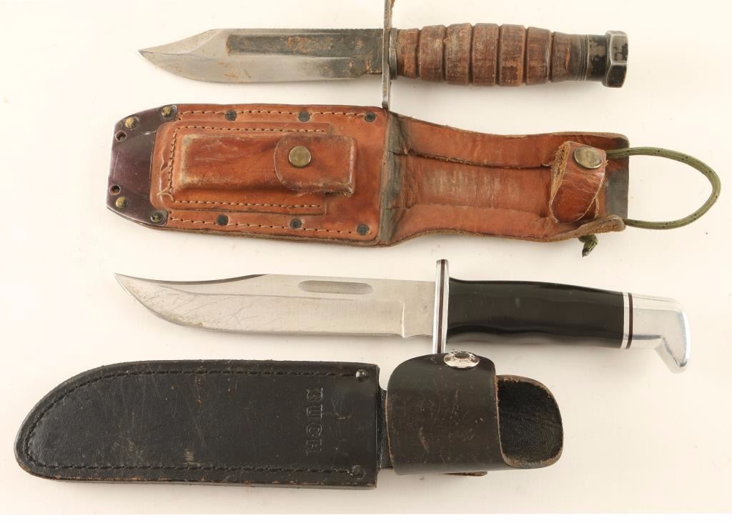 Including a Buck 119X measuring 10" overall with a 5" blade and includes a smooth black leather knife sheath, and a Kabar type knife measuring 9 1/2" overall with a 4" blade and includes sheath.