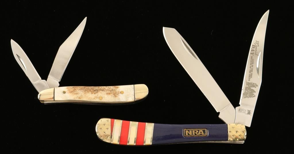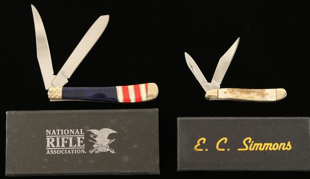 Includes an E.C. Simmons small double blade pocket knife with box and an NRA red-white-blue pocket knife.