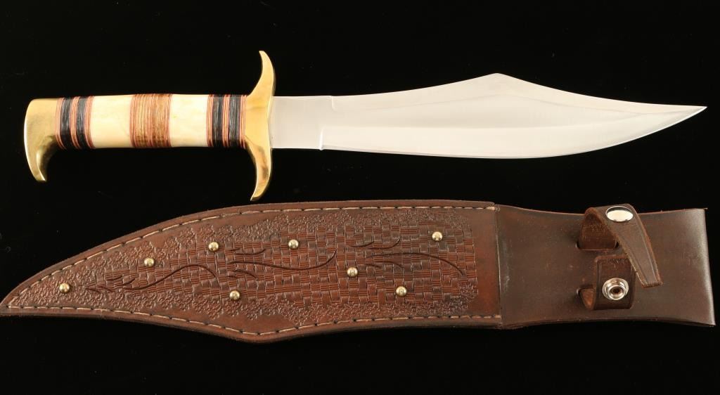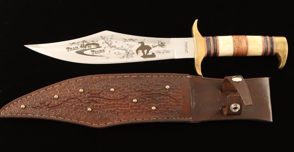 Made in the USA and beautifully decorated with brass implements and the 'Trail of Tears' scene depicted on the blade. Inscribed 'One of 500' and includes a woven faced and nicely tooled leather sheath. Measures 16 1/2" overall with a 9 3/4" blade.