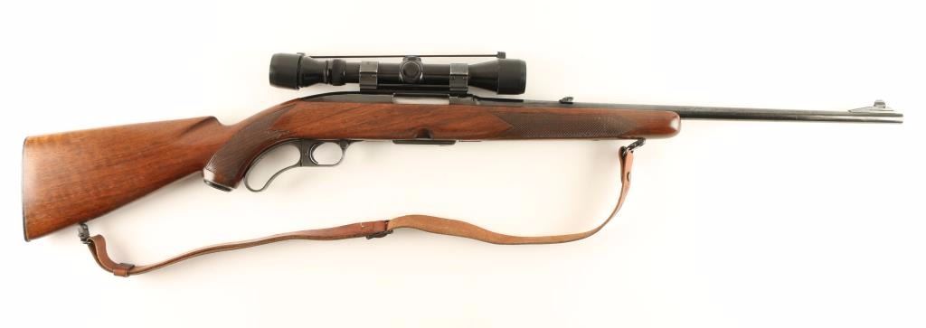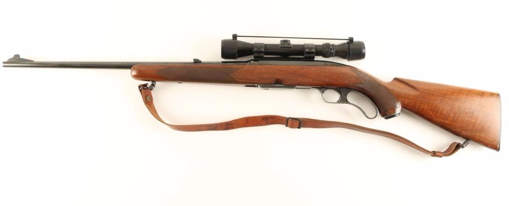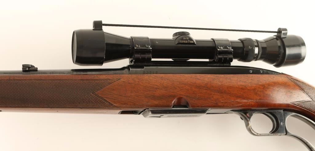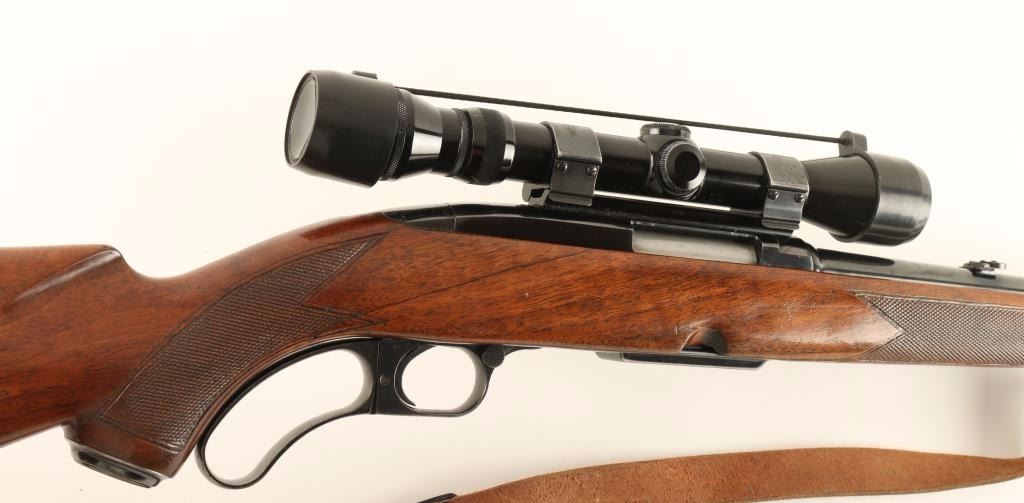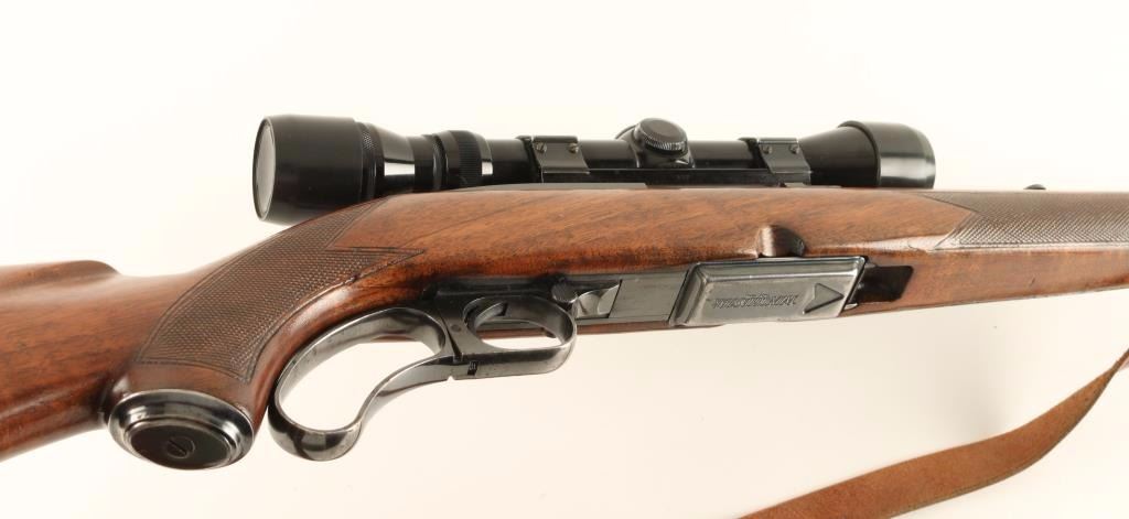 Magazine fed lever action sporting rifle chambered in .308 Winchester, circa 1958. Features a high polish blued finish, 22" barrel, ramped blade front sight, adjustable folding leaf rear sight, Redfield 2-7x scope, detachable magazine, serrated trigger, push button safety, smooth brown leather sling and hand checkered one piece pistol grip shoulder stock with checkered hard plastic buttplate. Rifle retains approximately 80% of it's original blued finish with nearly all the wear on the barrel forward of the sock. The barrel also has light scattered surface rust emerging and the recoil shield has a small amount of varnish on it. Action is smooth, bore is excellent, optics are clear and wood stock is near fine as revarnished. Condition is good to very good. ***C&R Firearm*** ***Modern Firearm***