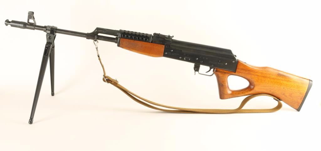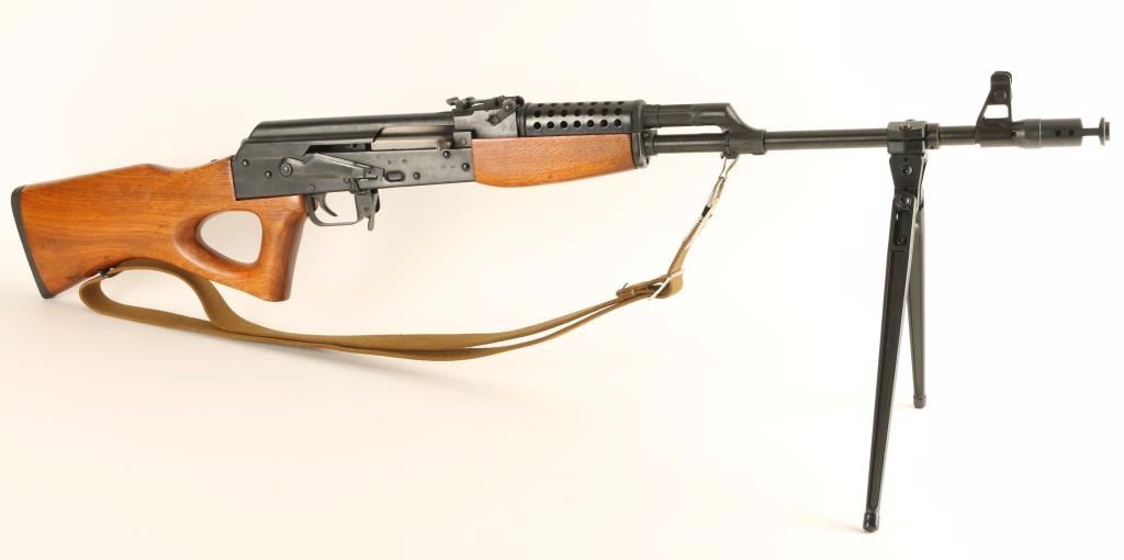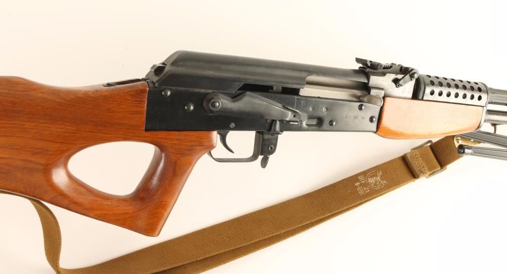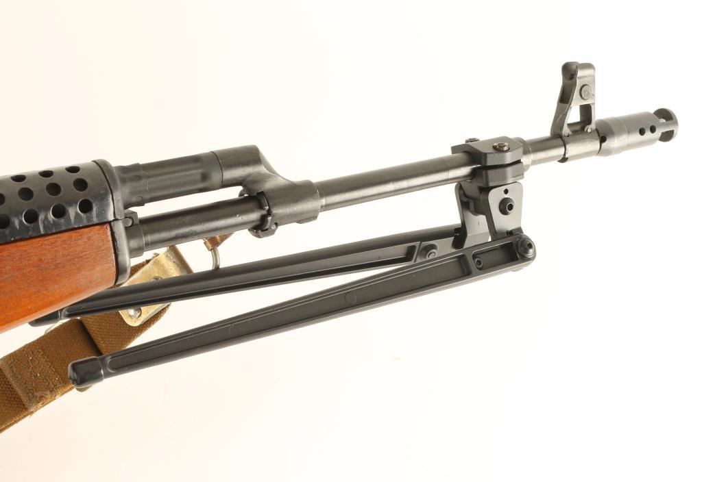 Chinese made AK style rifle chambered in 7.62x39mm. Features a blued finish, 21" threaded barrel with muzzle break, shrouded front sight, adjustable rear graduated sight, attacked folding bi-pod, gold canvas sling, manual safety, smooth trigger, black ventilated metal handguard, hardwood forearm, and thumbhole pistol grip shoulder stock. Rifle retains 94% of it's blued finish with few spots of light wear. Action is smooth, bore is pristine, are wood stocks are fine. Condition is excellent. ***Modern Firearm***