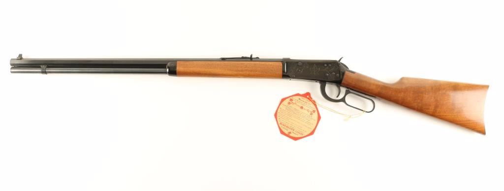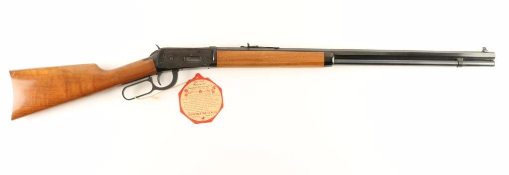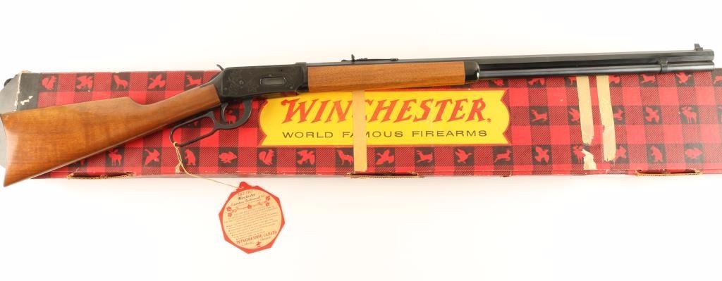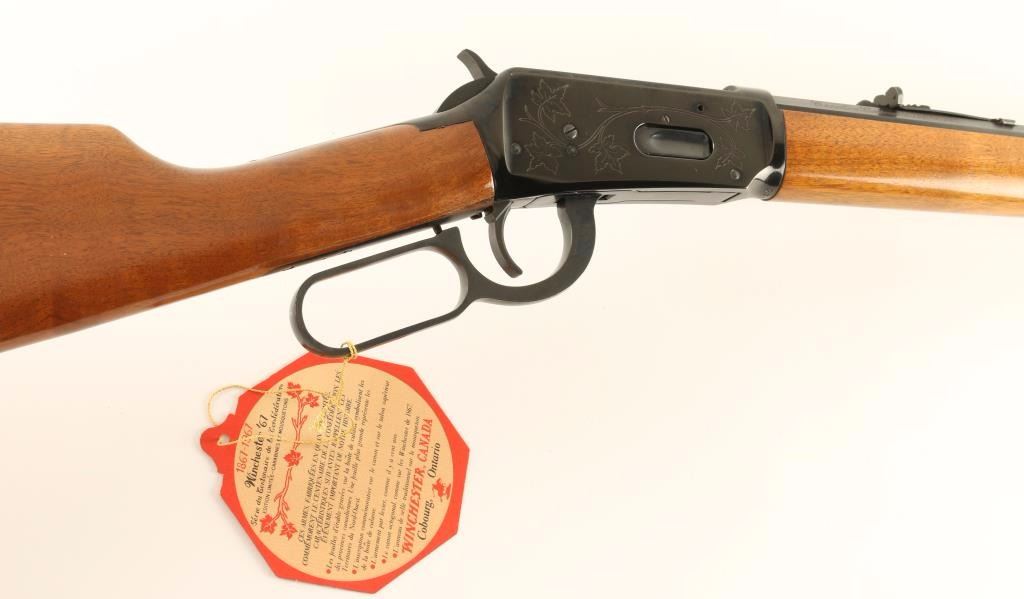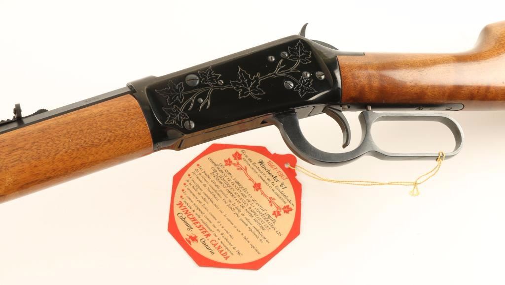 'Canadian Centennial 1867-1967' Lever action commemorative repeating rifle chambered in .30-30 Winchester, circa 1967. Features a fully blued finish, 26" octagonal barrel, full tube magazine, blade front sight, adjustable rear sporting sight, maple leaf engraved receiver, beveled trigger serrated hammer spur, smooth wood forend with metal cap and straight grip shoulder stock with metal buttplate. Includes the original factory plaid pattern cardboard box with hang tag, documents and tissue paper. Finish shows little wear with some flaking on the receiver. Rifle also exhibits an orange powdery substance in many small crevices, possible surface rust. Action is smooth, bore is pristine and wood stocks are fine. Condition is near excellent. ***C&R Firearm*** ***Modern Firearm***