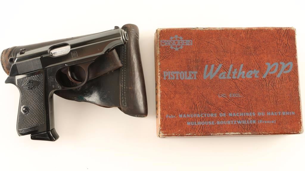 French made, licensed copy of the Walther PP double action semi-automatic pistol chambered in 7.65mm, circa 1950's. This pistol bares the markings 'Nds" which was a making used by the Niedersachsen, West Germany Police. Features a blued finish, 4" barrel, dovetailed rear sight, smooth trigger, thumb safety, serrated round hammer spur, push button safety, 8 round magazine and black checkered plastic grips. Includes original factory box, documents, test fire target, extra magazine and period smooth black leather holster marked A. Wunderlich Nache, Berlin, 1936. Pistol shows only faint holster wear with approximately 96% finish exhibited. Action is crisp, bore is pristine and grips are fine. Condition is excellent in box. ***C&R Firearm*** ***Modern Firearm***