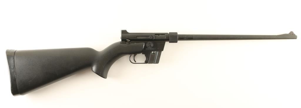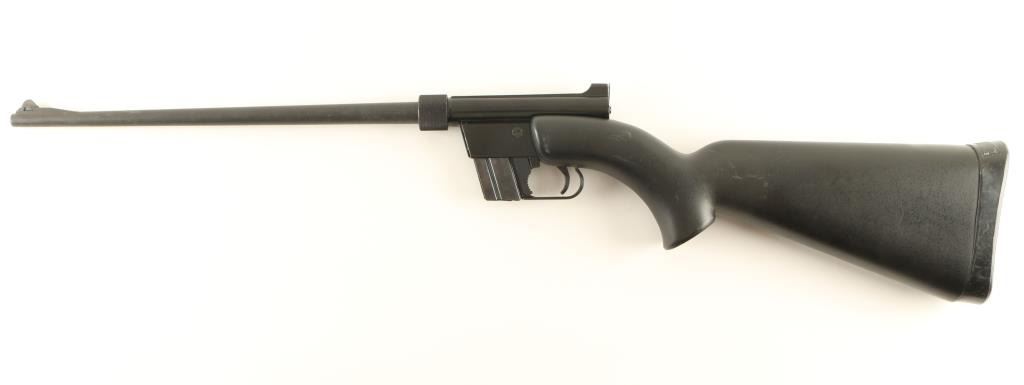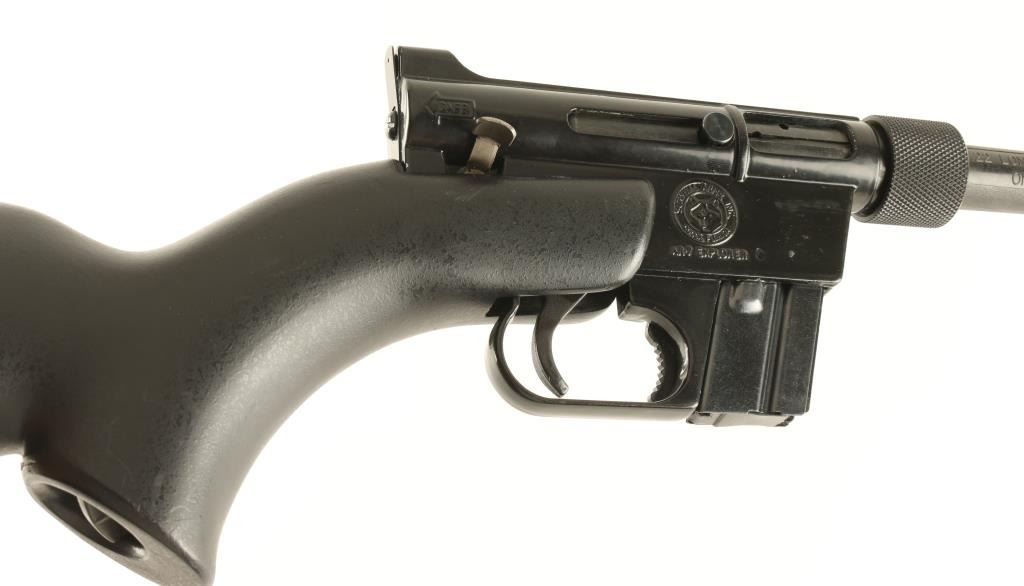 'Explorer' Breakdown semi-automatic survival rifle chambered in .22 Long Rifle. Features a black finish, 16" steel lined barrel, ramped blade front sight, adjustable rear aperture sight, safety switch, 8 round magazine serrated trigger, and smooth black synthetic waterproof stock. Receiver shows some light scuffs & imperfections under finish and barrel shows scratches near the muzzle. Action is smooth, bore is excellent and stock is very good. Condition is very good+. ***Modern Firearm***