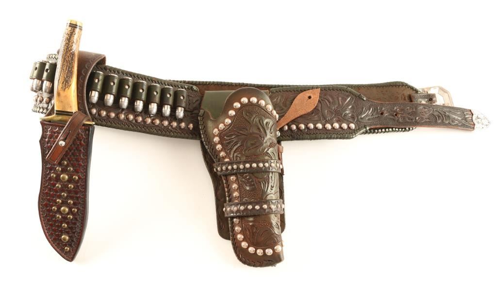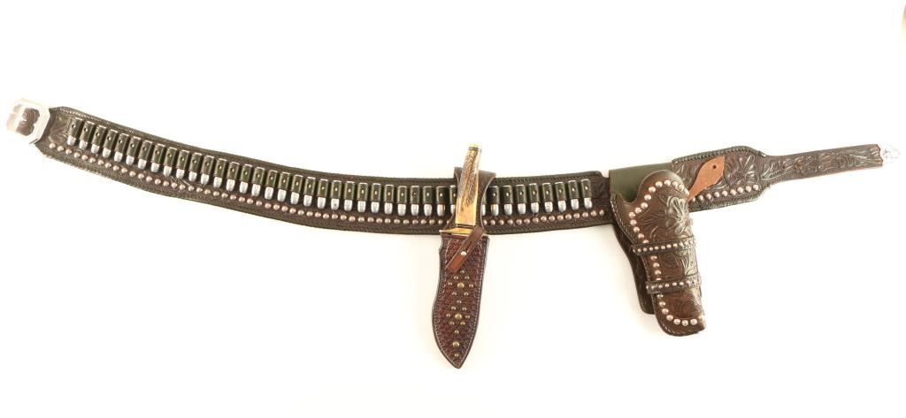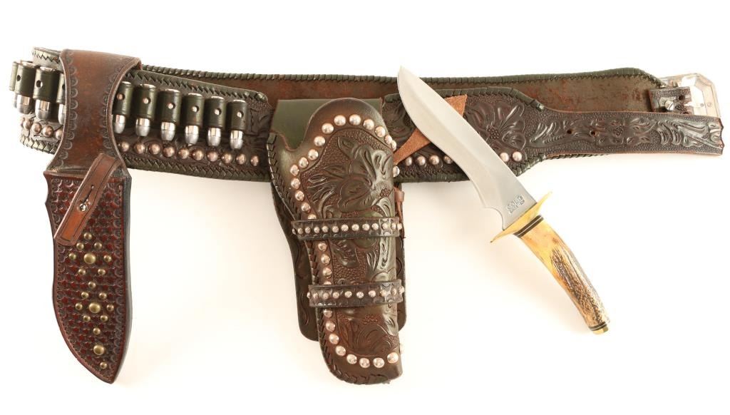Accommodates a .45 Colt SAA (4 3/4 or 5", size 36-38) and features sterling silver spots, floral tooling and includes a Colt knife with sheath on the rig. Maker marked twice by Charlie Jackson, Sun City, AZ.