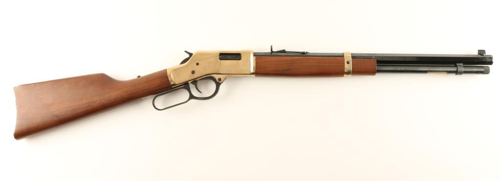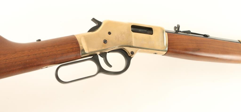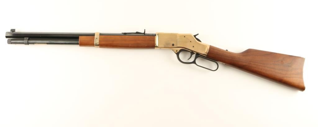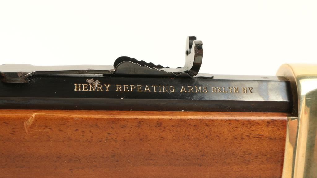 American lever action repeating rifle loosely based on the iconic 1860 Henry. Features a blued 20" octagonal barrel, full tube magazine, blade front sight with gold bead, adjustable buckhorn rear sight, brass colored frame, smooth trigger, serrated hammer spur, brass barrel band, smooth wood forend and straight grip shoulder stock with brass buttplate. Barrel retains approximately 82% of it's blued finish with scattered losses & some light surface rust forming. High polished receiver shows light handling marks and some oxidation. Action is smooth, bore is very god and wood stocks are near fine. Condition is good. ***Modern Firearm***