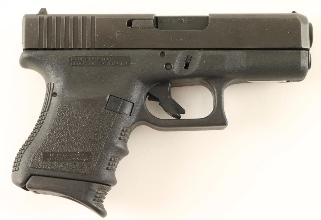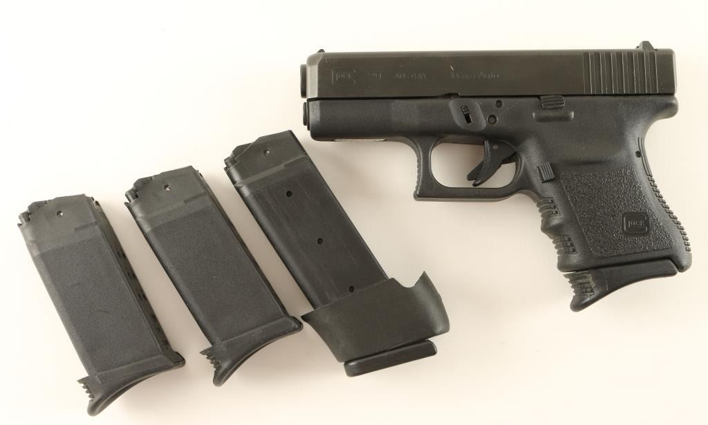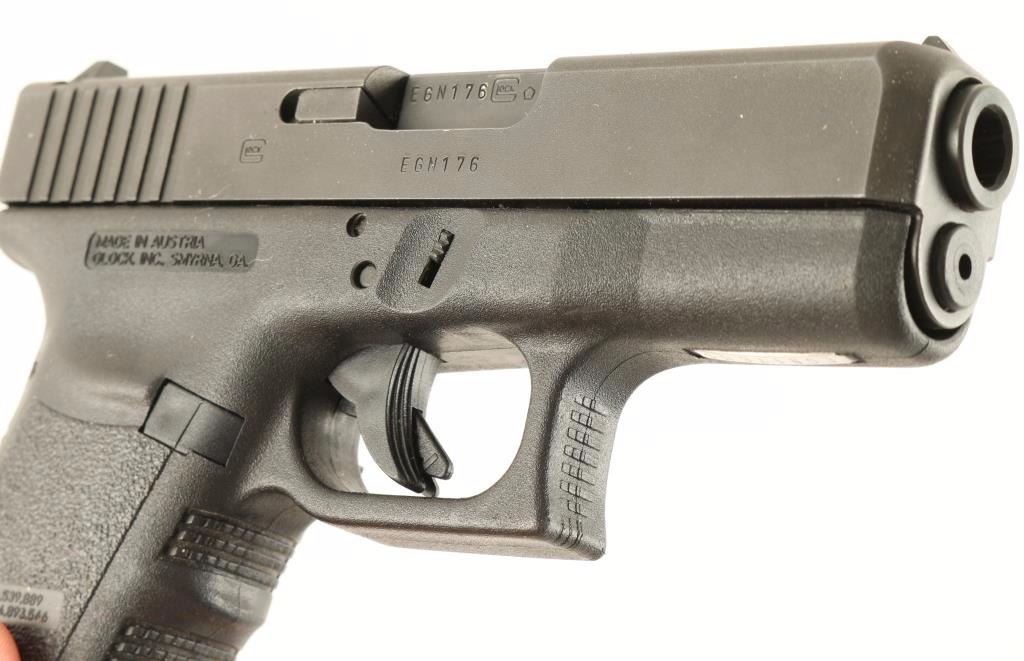 'Third Generation' Subcompact Austrian made safe action semi-automatic pistol chambered in 10mm Auto. Features a matte black finish, 3.77" barrel, high contrast sights,10 round factory magazine with Pearce Grip extension, trigger safety and black polymer frame with integral finger groove grip. Includes two extra 10 round factor magazines with Pearce grip extensions, a speed loader and a 15 round factory mag with grip extension. Pistol exhibits little to no wear. Action is smooth, bore is pristine and polymer is fine. Condition is excellent. ***Modern Firearm***