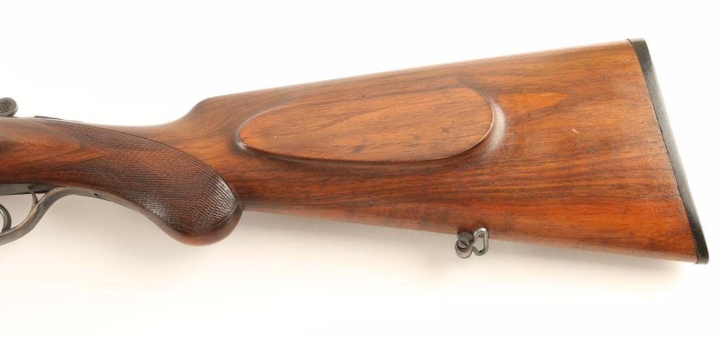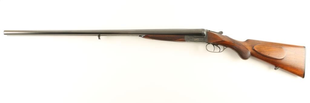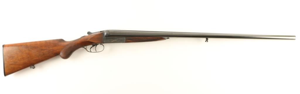 Nicely refinished Belgium made double barrel side by side shotgun chambered for 12 gauge shells. Features a blued refinish, black powder proofed 30" barrels with solid rib, brass front sight, boxlock action, extractor, light floral engraved receiver with gold embellishments, checkered top lever, double triggers, sling swivels, tang safety, case hardened trigger guard, checkered wood forend and shoulder stock with round pistol grip knob & cheek rest. Shotgun exhibits approximately 97% of it's blued finish with some light surface rust evident behind the triggers. Action is crisp, bores are very good and checkered wood stocks are worn semi-smooth from refinishing. Condition is near excellent. ***Antique Firearm***