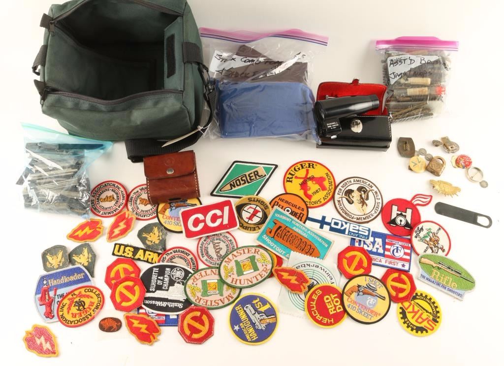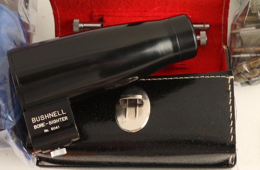 Includes stock foam pads, shock eliminator pads, stripper clips, gun related patches, a Bushnell bore sighter kit, vintage pins, a Colt barrel wrench, used brushes, and a leather magazine pouch. All of which is inside a Remington canvas bag.