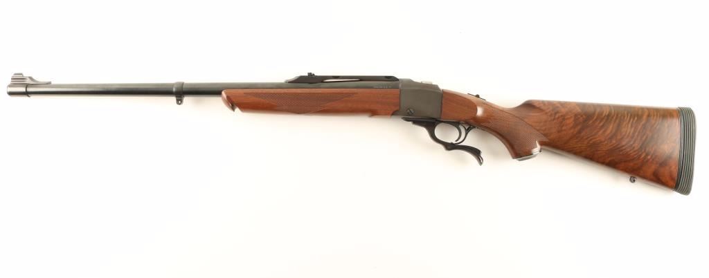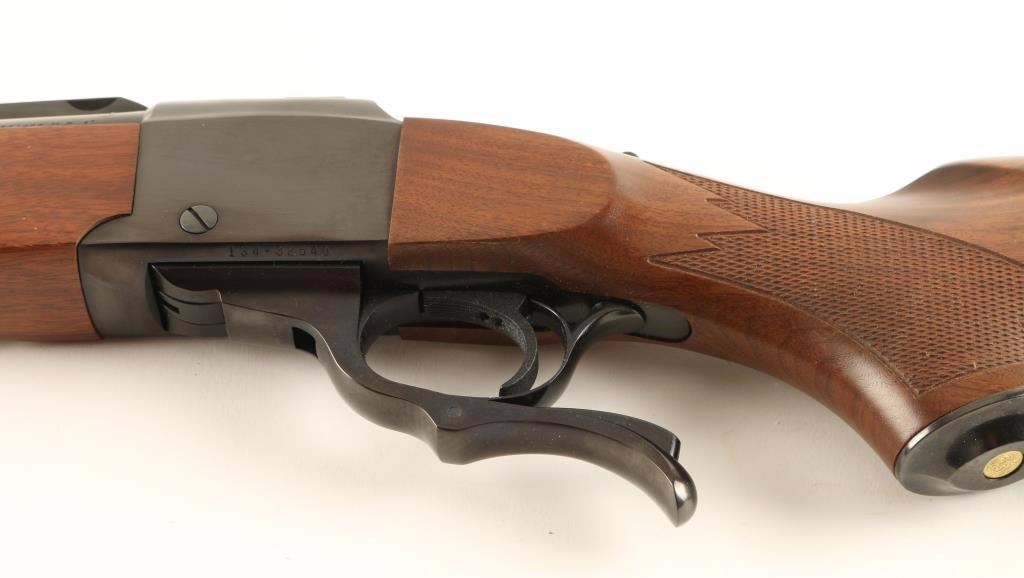 American single shot falling block rifle chambered in .450/400 Nitro Express 3", circa 2010. Features a blued finish, 24" factory barrel, ramped blade front sight with brass bead, adjustable folding leaf rear sight, integral scope base, serrated trigger, sliding tang safety, swivel studs, checkered walnut forend and pistol grip shoulder stock with Limbsaver recoil pad & metal grip cap. Includes the original factory cardboard box with documents. Rifle shows very little wear with only a few light handling marks. Action is smooth, bore is excellent, and wood stocks are near fine with a few small blemishes. Condition is near new in box. ***Modern Firearm***