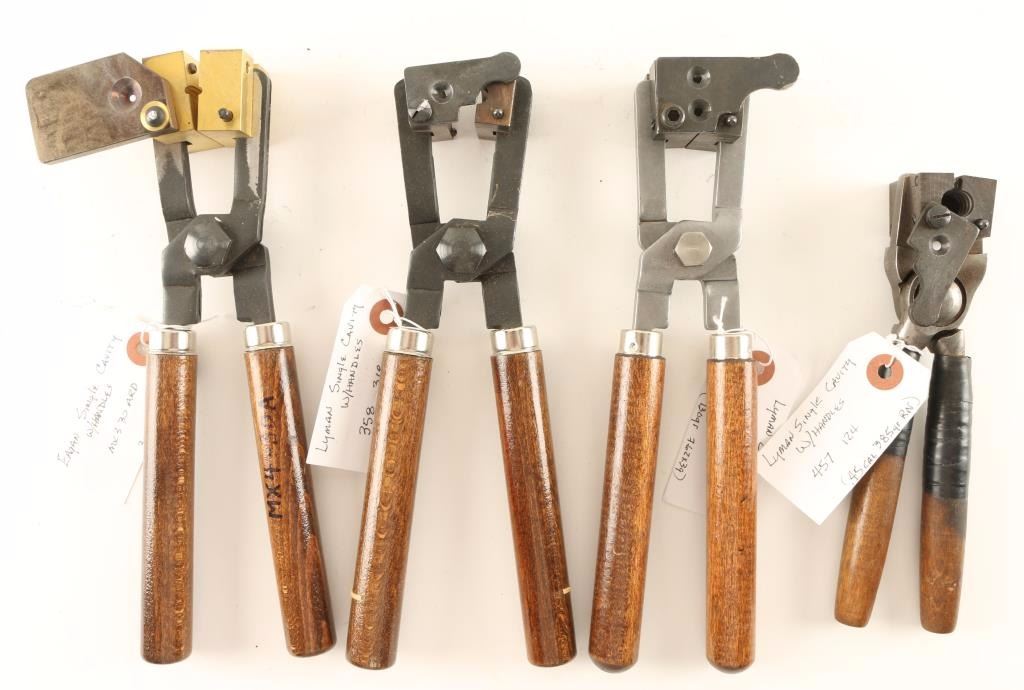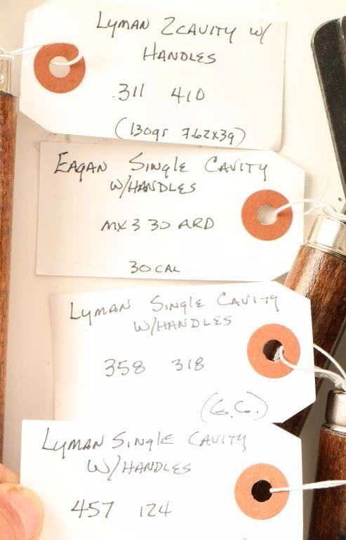Includes an Eagan single cavity MX3 30 ARD mold, a Lyman single cavity .457-124 mold, a Lyman single cavity .358-318 mold, and a Lyman 2 cavity .311-410 mold, all with wooden handles.