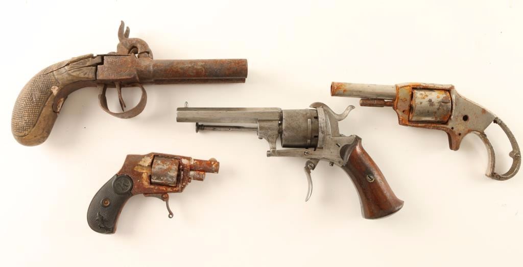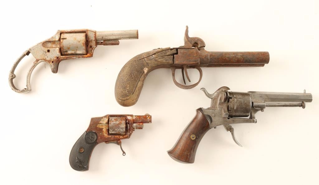 Including a Baby Hammerless - heavily rusted, Double Barrel Percussion Pistol - heavily rusted with broken grip, Defender Revolver - stripped & rusted, and a Belgium Pinfire revolver with ill-working action.