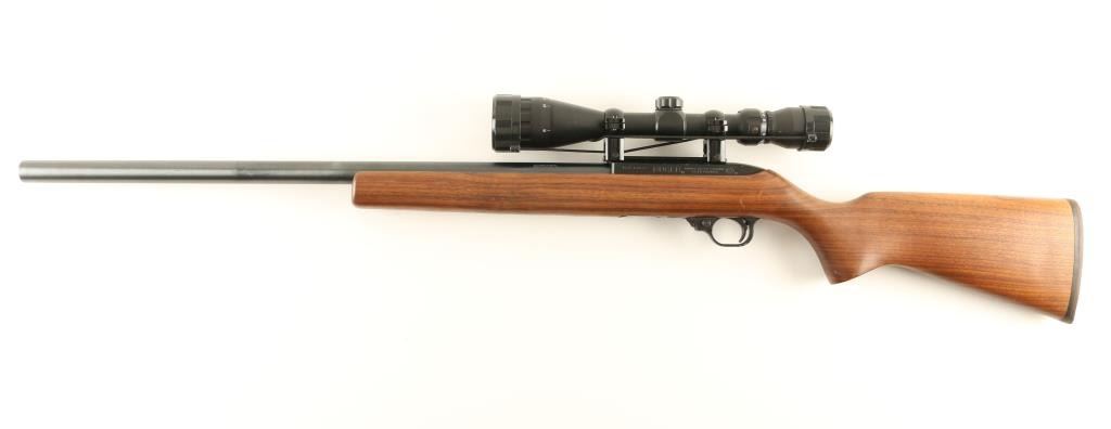 Customized semi-automatic target rifle chambered in .22 Long Rifle. Features a blued finish, 24" Gun Parts Corp. bull barrel with recessed crown, Eagle Eye Optics 3-12x scope on see-through rings, 10 round factory magazine, smooth trigger, push button safety, oversized one piece pistol grip shoulder stock with rubber recoil pad. Finish exhibits only a few handling marks on the barrel and some high point edge wear on the receiver with approximately 95% bluing intact overall. Action is smooth, bore is excellent and wood stock is fine. Condition is near excellent. ***Modern Firearm***