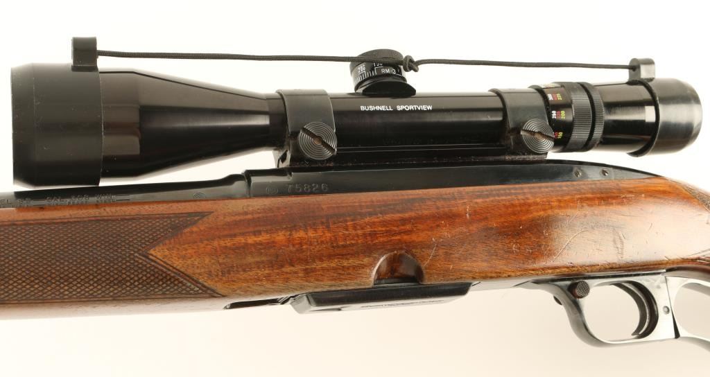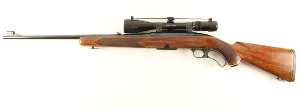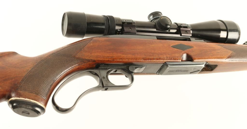 Magazine fed lever action sporting rifle chambered in .308 Winchester, circa 1959. Features a blued finish, 22" barrel, ramped & hooded front sight, adjustable flip-up rear sight, Bushnell Sportsview 3-9x scope, detachable magazine, serrated trigger, push button safety, sling swivels and hand checkered one piece pistol grip shoulder stock with recoil pad. Rifle retains approximately 95% of it's original blued finish showing a few small scraped on the barrel forward of the stock. Action is smooth, bore is excellent, optics have a damaged reticle and wood stock is good. Condition is good to very good. ***C&R Firearm*** ***Modern Firearm***