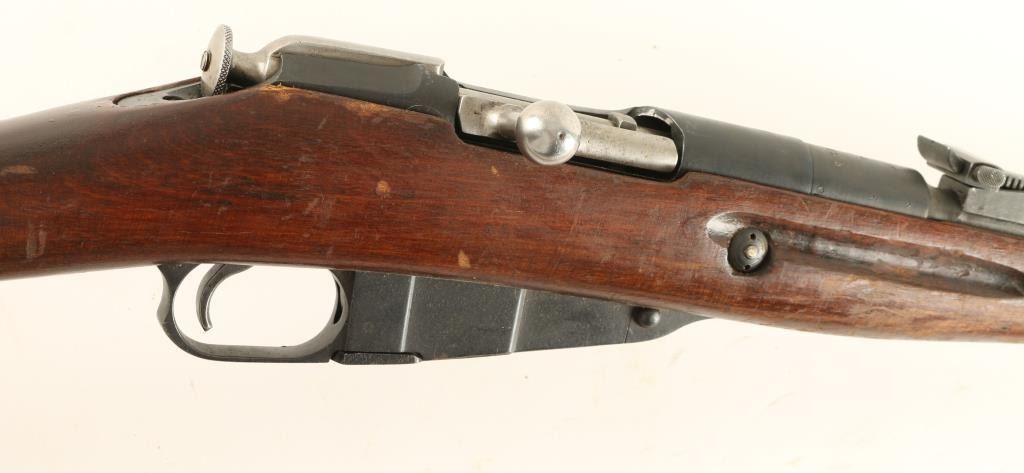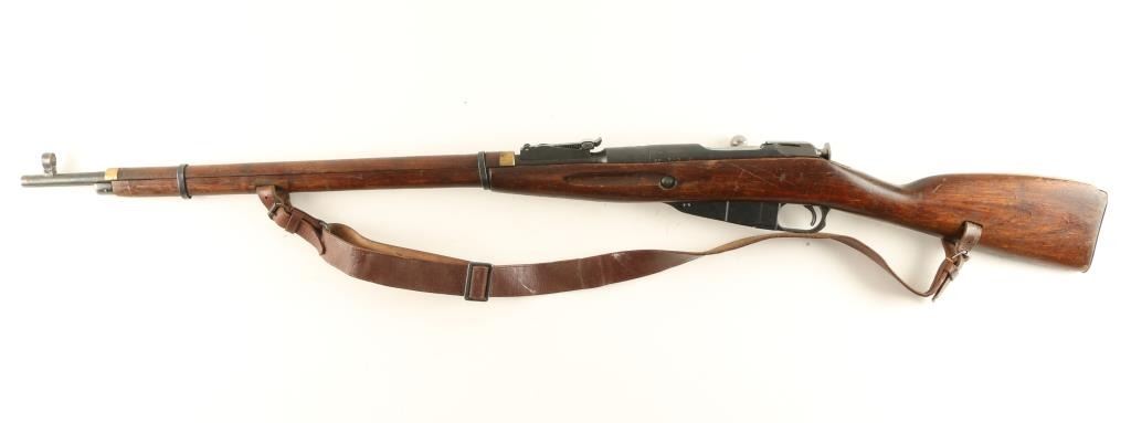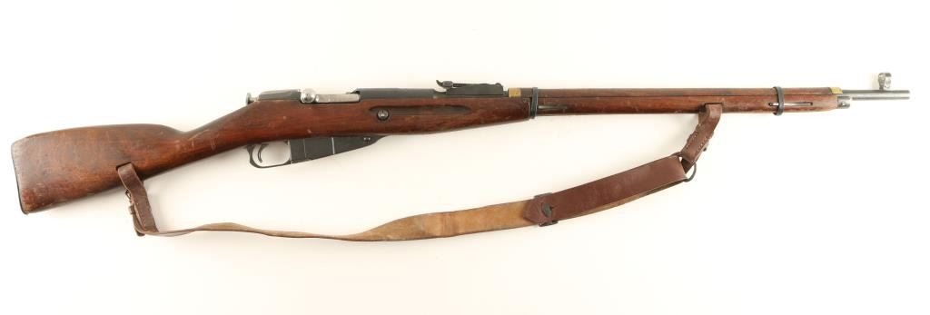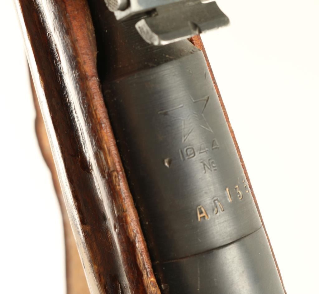 Russian military bolt action service rifle chambered in 7.62x54Rmm, circa 1944. Featured a blued finish, Tula marked 28.7" tapered barrel, hooded post front sight, graduated rear sight to 2,000 meters, brown leather sling, internal box magazine, straight bolt handle, two barrel bands, smooth wood handguard and straight grip shoulder stock with metal buttplate. Serial numbers match on barrel, buttplate, receiver, floorplate(forced) & bolt(forced). Import marks on barrel. Finish is approximately 90% intact showing little wear. Action functions well, bore is dark with good rifling and wood stock is good. Condition is good+. ***C&R Firearm*** ***Modern Firearm***