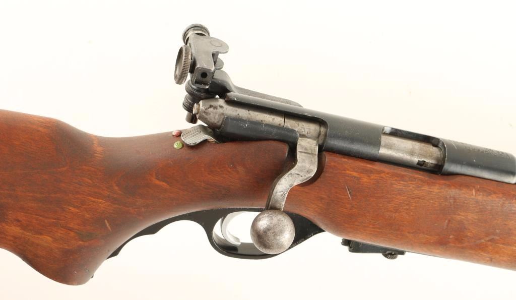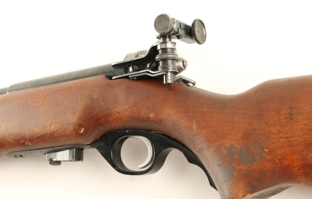 U.S. Property marked bolt action training rifle chambered in .22 Long Rifle. Features a blued finish, 26" barrel, blade front sight, Mossberg Microclick S-100 adjustable peep sight, detachable magazine, serrated trigger, sling swivels, manual safety, finger groove trigger guard and one piece wood pistol grip shoulder stock. Rifle retains approximately 87% of it's blued finish showing a few small losses and some light scratches. Action functions well, bore is very good and wood stock is good & has a Chinese stamp on the end of the pistol grip. Condition is very good. ***Modern Firearm***