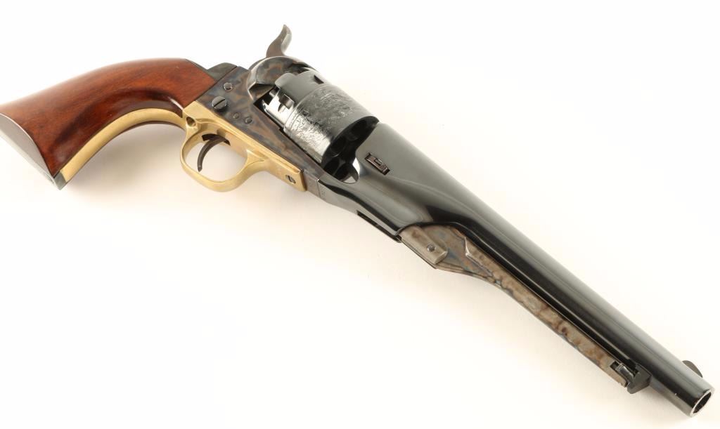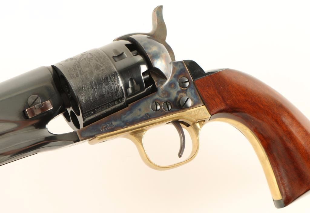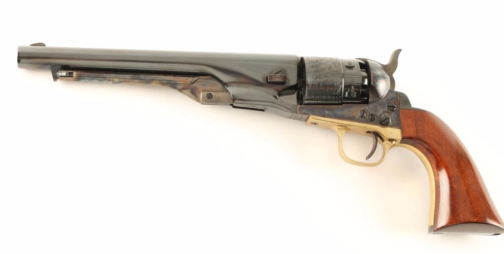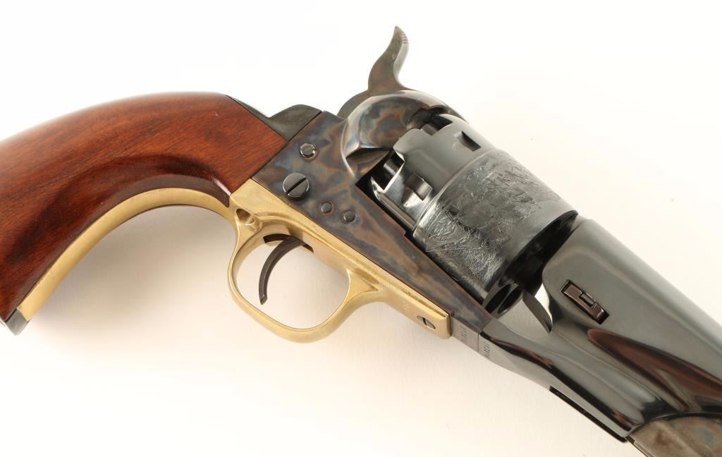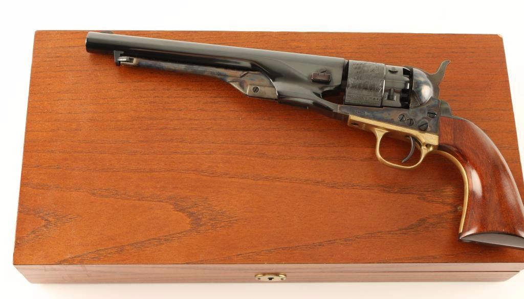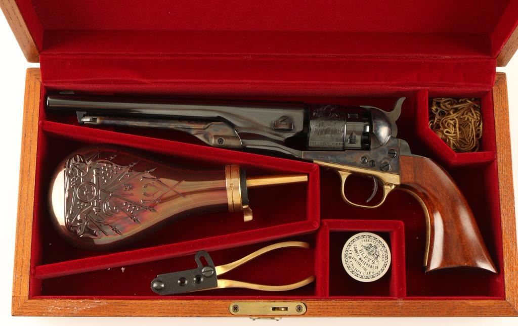 'Signature Series' Modern production single action percussion revolver chambered for .36 caliber ammunition. Features a blued 8" barrel, blade front sight, notched rear sight, case hardened loading lever, frame & hammer, blued six shot cylinder with a roll stamped naval scene, blued backstrap, provisions for a shoulder stock, brass triggerguard, and one piece walnut grips. Includes a custom compartmentalized display case red velvet lining, powder flask, bullet mold, cap container, manual and key. Revolver retains approximately 99% of it's original finish showing vivid case colors, beautiful deep bluing and few light handling marks. Condition is excellent. ***Antique Firearm***
